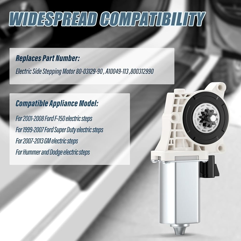 【Application】This Electric Side Step Motor replaces part number 80-03129-90, A10049-113, 800312990 and is compatible with Ford F-150, Super Duty, GM, Hummer, and Dodge models equipped with electric steps.