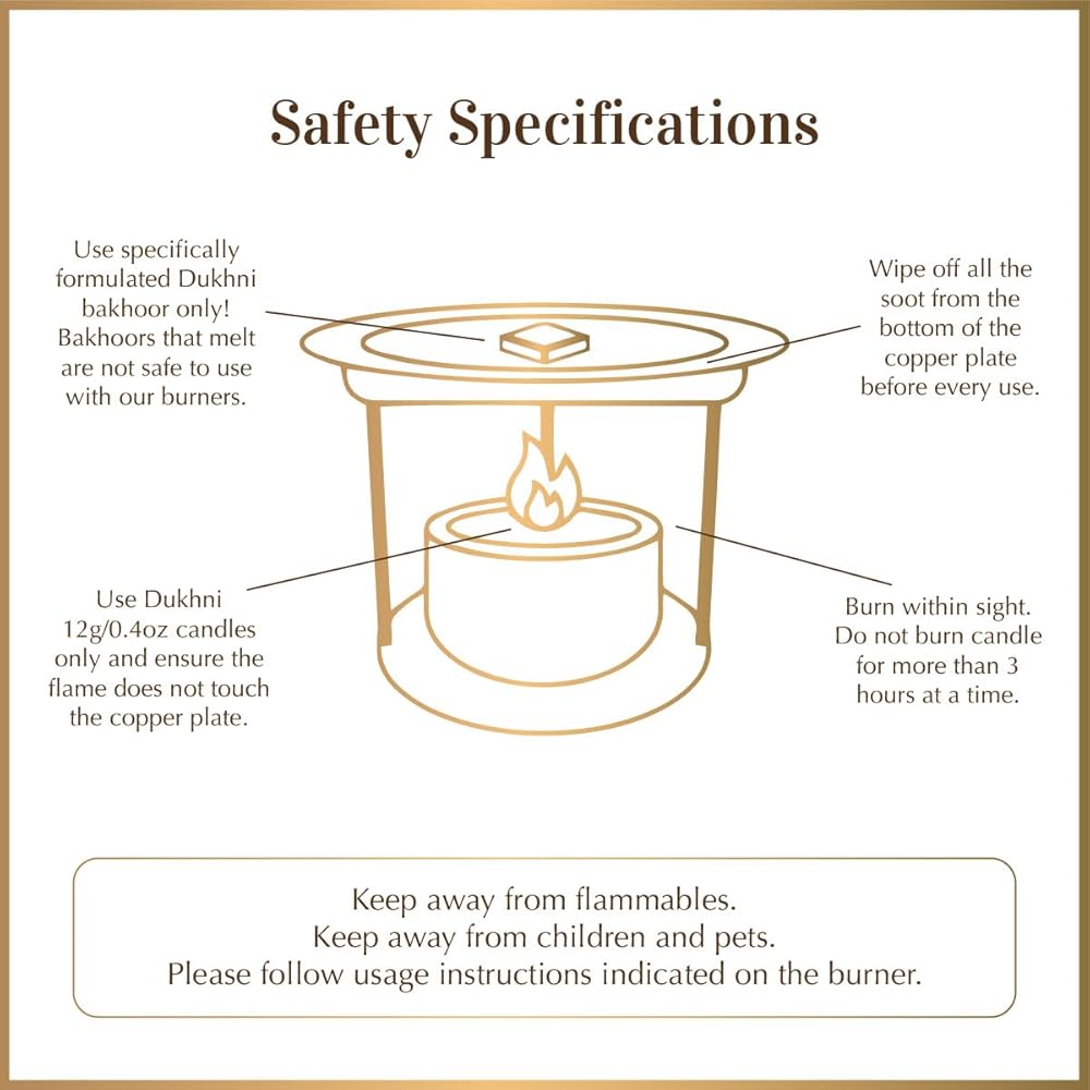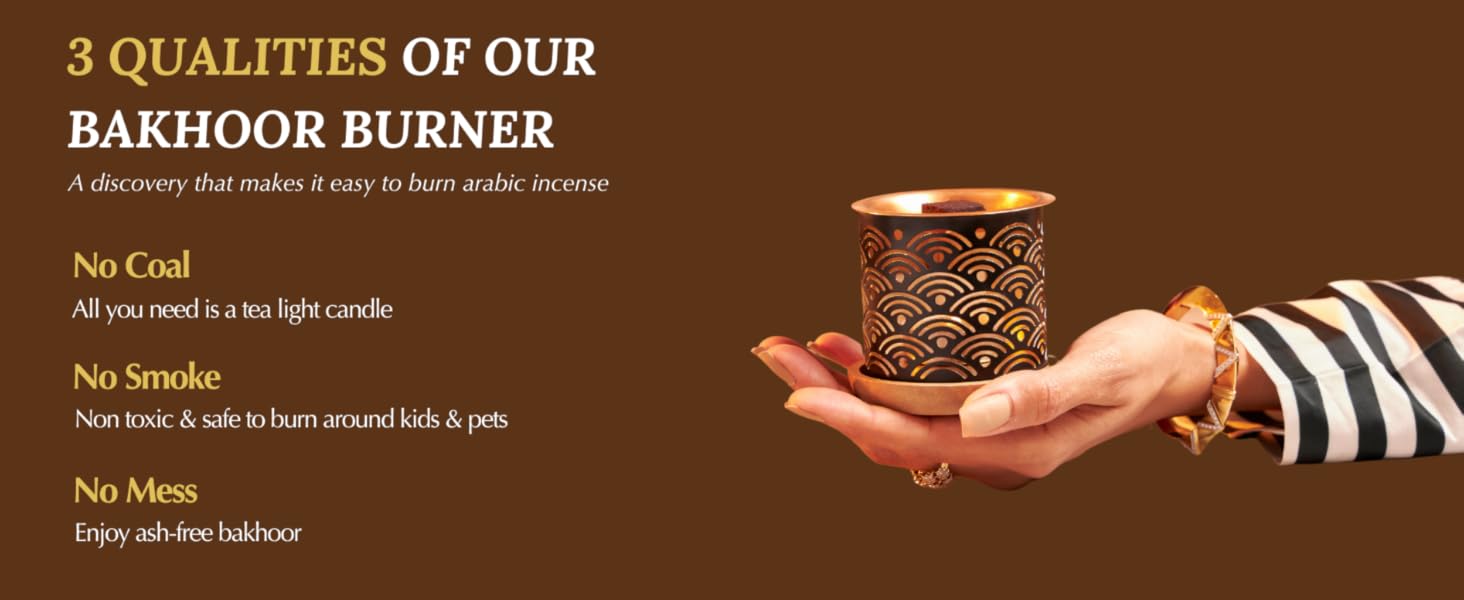 HOW TO USE: Although bakhoor is traditionally burned on charcoal, our custom burners allow for a new way of burning bakhoor with ease. Simply place a piece of bakhoor on the copper plate and light the tealight below. We recommend tealight candles with a 3.5 to 4 hour burn time. The beauty of our burner is that it burns without smoke, steadily building up the flavour of the bakhoor and ensuring its longevity. In an unventilated room, the aroma of the bakhoor will spread to about 400 square feet