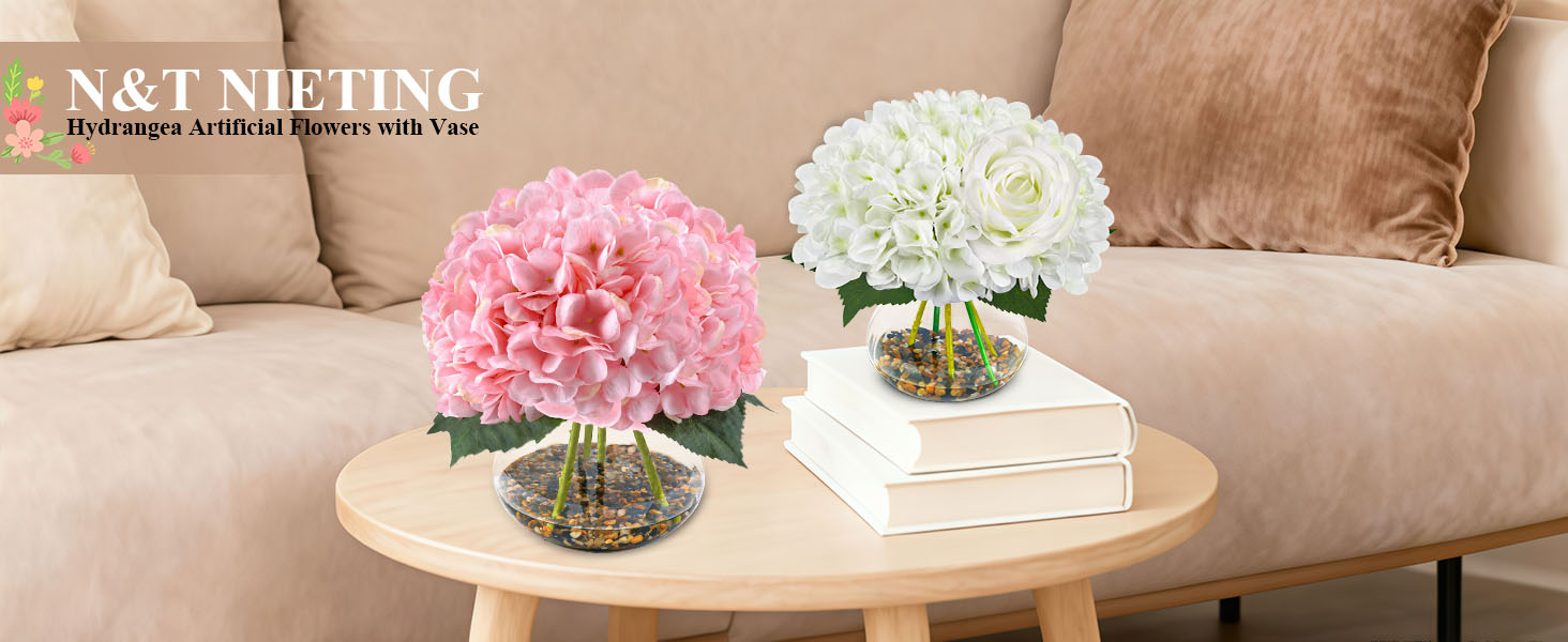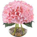 Fake Flowers with Vase: Hydrangea artificial flowers is paired with a glass vase containing a rainflower stone. Unlike other artificial hydrangeas, the rainflower stone adds beauty and realism to the pink faux hydrangea flowers, giving people a different visual enjoyment.Our hydrangea artificial flower comes with vase decoration, no need to purchase a new vase