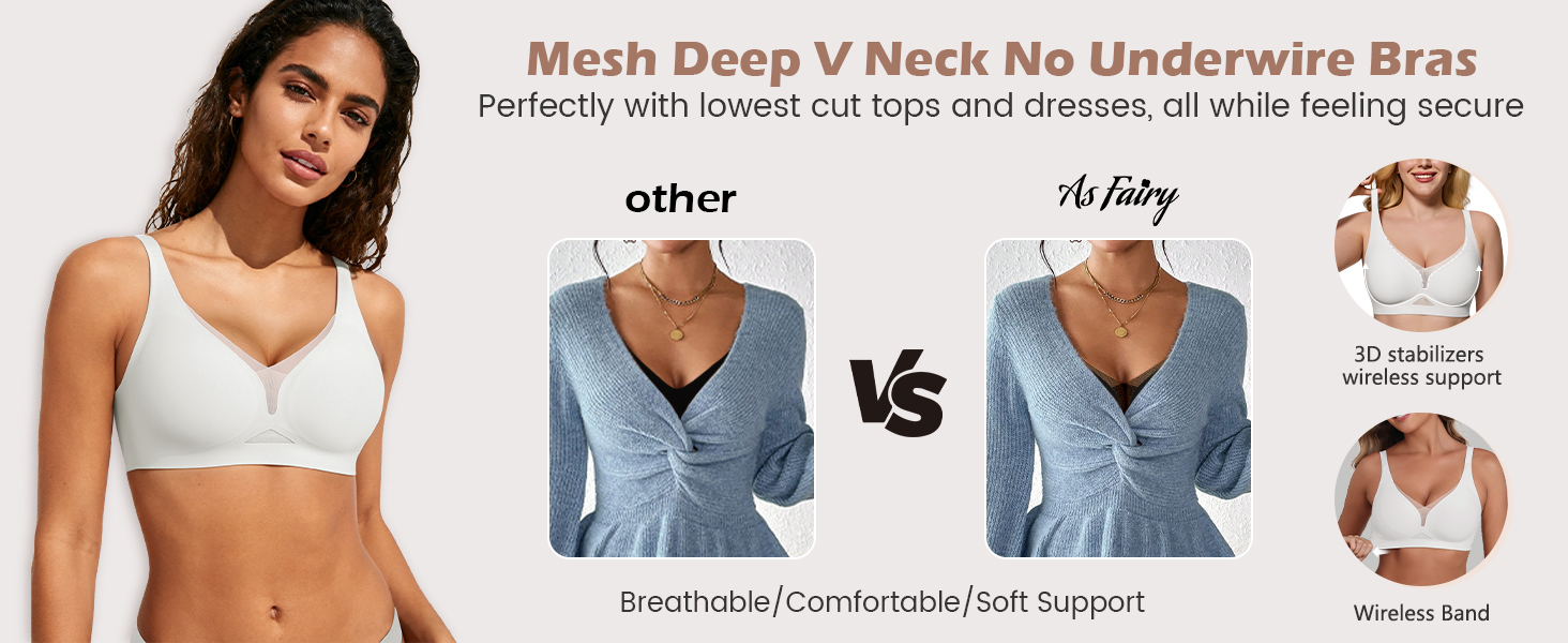 【Deep V Breathable Mesh for Cool Comfort】Featuring a flattering deep V neckline with triangular and quadrilateral mesh panels, this bra enhances airflow and wicks away moisture quickly. It keeps you cool, dry, and fresh even in warm weather or during daily activity, so you stay comfortable without stuffiness or stickiness