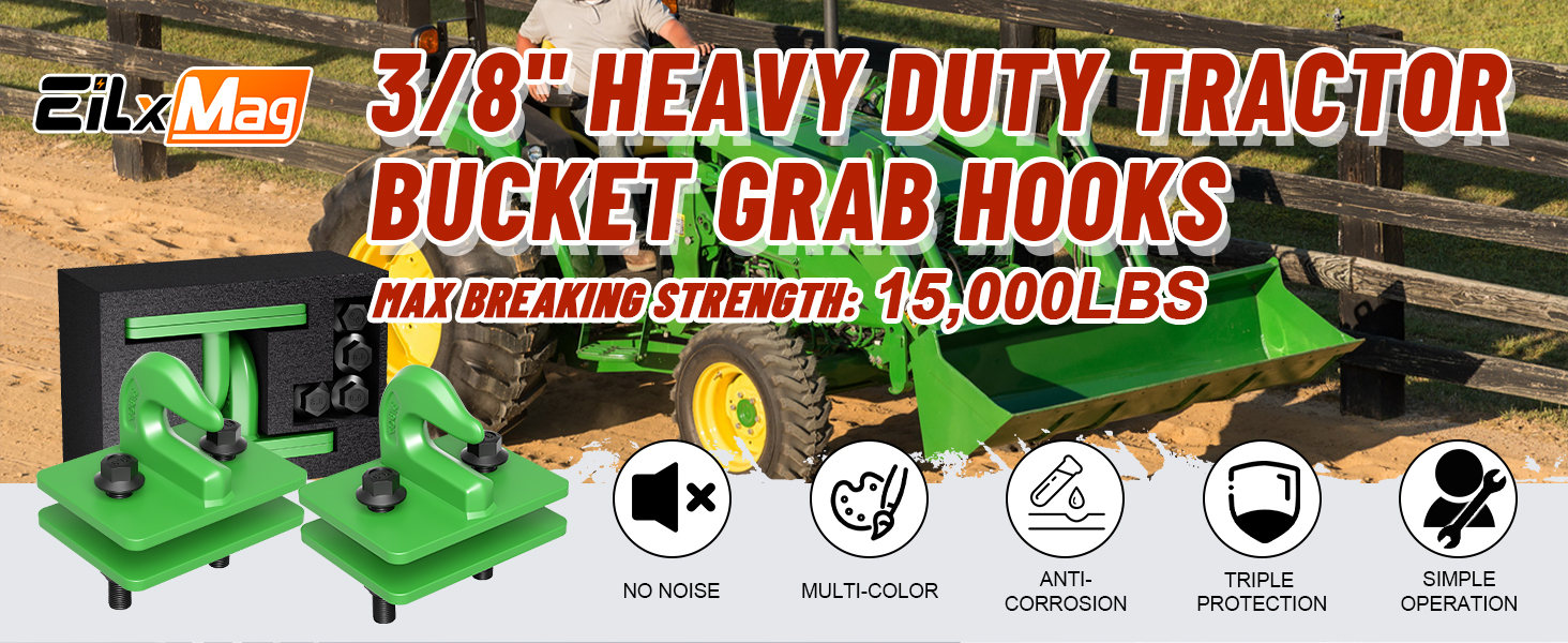 WIDE APPLICATION: EilxMag heavy duty tractor hook is suitable for almost all farm vehicles such as John Deere trucks, tractor buckets, lawn mowers, RVs, UTVs, ATVs; it can be mounted on tractor buckets and used with chains, straps, ropes and ratchet clips