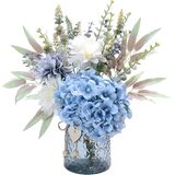 Realistic & Elegant: This arrangement features a bouquet of blue artificial flowers and eucalyptus, presented in a glass vase adorned with twine. The mix of vibrant flowers and faux plants adds a unique touch to your decor. The coordinated colors with the glass vase create a natural yet distinctive look, bringing elegance and charm to any space.