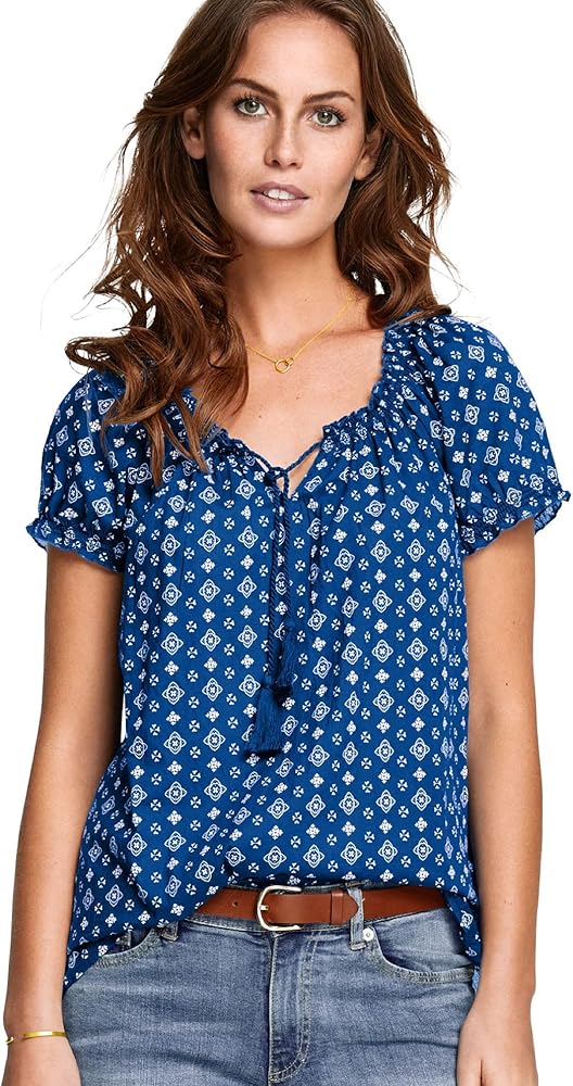 Ruffles at the elasticized cap sleeves & a braided tassel tie at the neckline add a feminine touch to this boho-inspired peasant blouse.