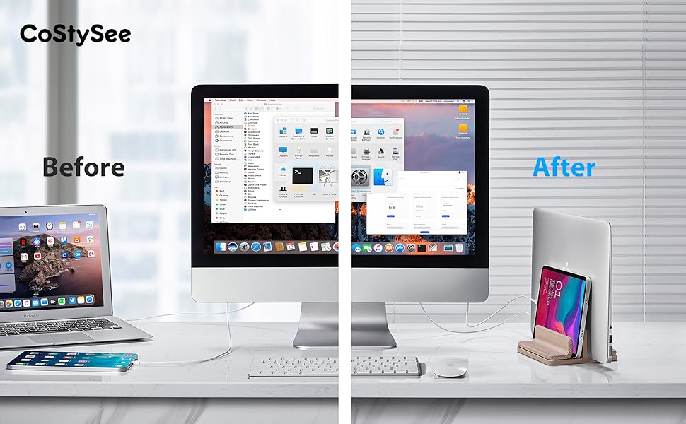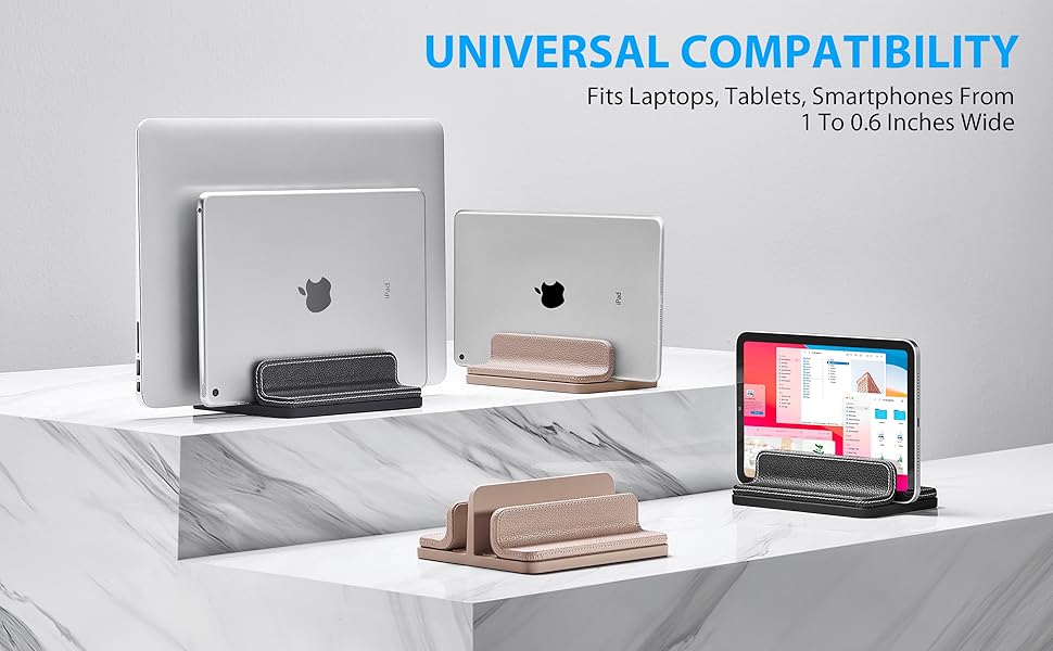 【Optimize Desktop Space】The dual-slot vertical stand can cradle up two laptops or phone iPad at the same time, it will keeping your desktop organized and saving space