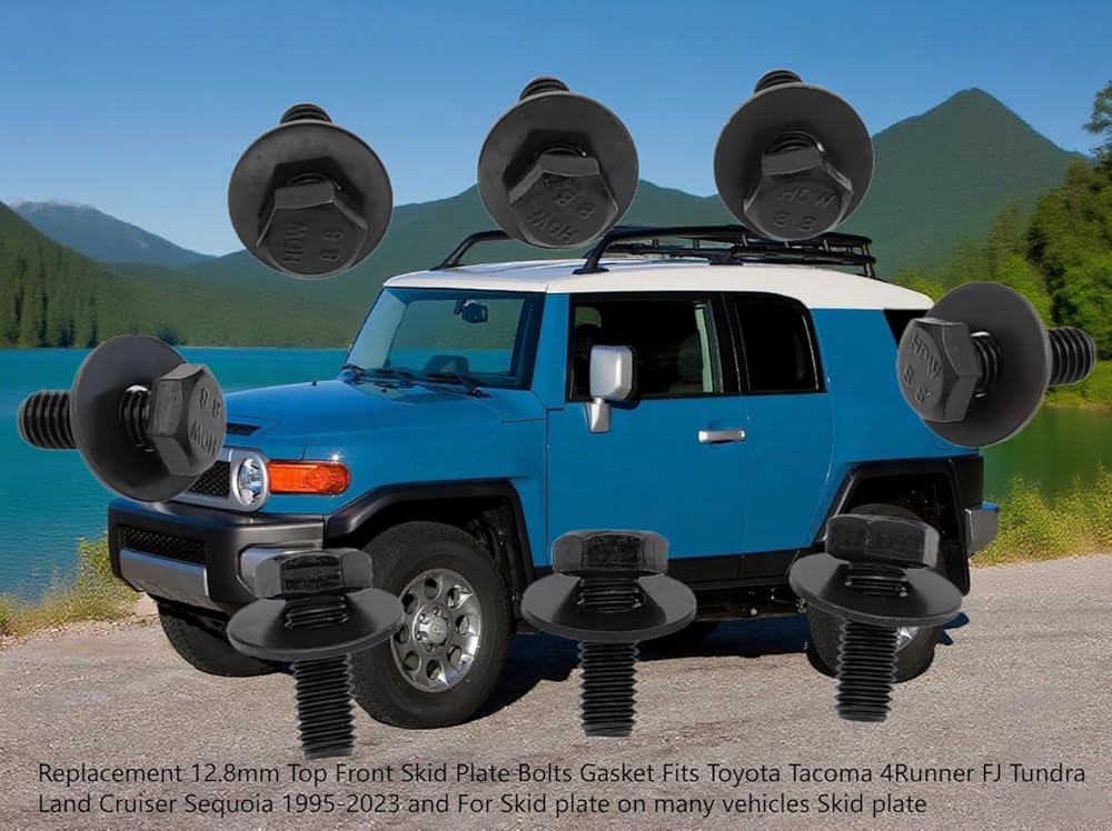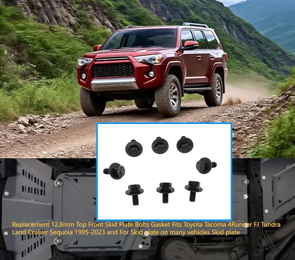 8 Pack 12.8mm Top Front Skid Plate Bolts and 8 Pack Skid Plate Gasket Compatible with Following Models Fits To-yo-ta 4Runner 1996-2023 Fits To-yo-ta Tacoma 1995-2023 Fits To-yo-ta Tundra 2000-2010 Fits To-yo-ta FJ Cruiser 2007-2014 Fits To-yo-ta Land Cruiser 2008-2010 Fits To-yo-ta Sequoia 2001-2007 The 12.8mm means it is the To-yo-ta Bolt that uses the 12.8mm wrench to bolt it in It is for the Skid plate on many vehicles but can be used in other areas on Cars and To-yo-ta Trucks