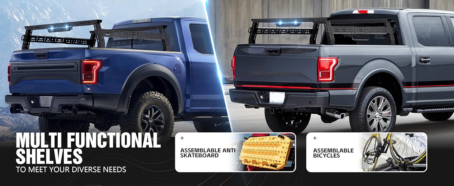 【Easy Installation】: No drilling, cutting, or modification required. It securely mounts onto the truck's bed rail system and includes all necessary hardware for easy installation. (Note: Regularly check the rack hardware for looseness before driving to ensure cargo safety.)