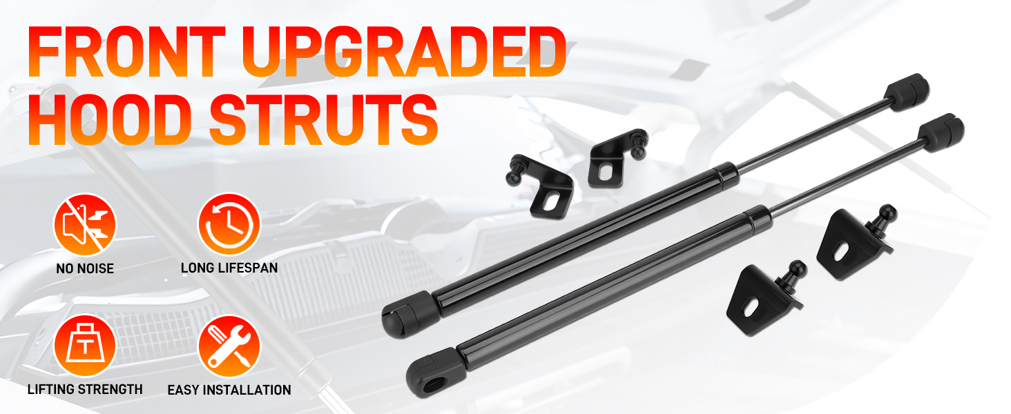 【Progressive Gas Spring】Featuring a progressive mechanical design specifically tailored to each vehicle model, the gas spring maintains a constant orientation with the spring body end facing upwards, the larger tube connected to the hood bracket, and the extension rod connected to the lower ball stud. This design slows down the extension speed during the last few inches of travel, thereby eliminating stress on the hood