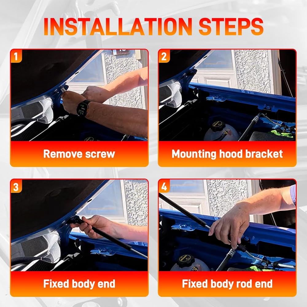 【Function】This system replaces the original hood support rod with a bracket and gas cylinder, simplifying the engine compartment. It allows you to easily lift the hood and provides a clear view of the engine area. With just a gentle lift, the hood will automatically and smoothly rise into place