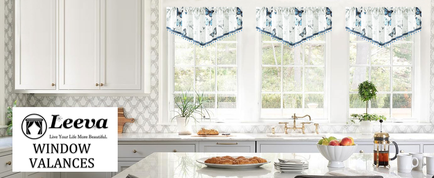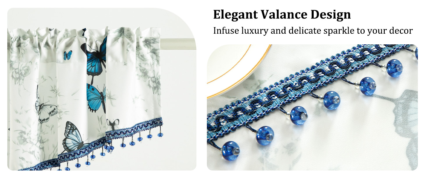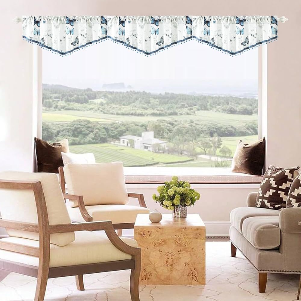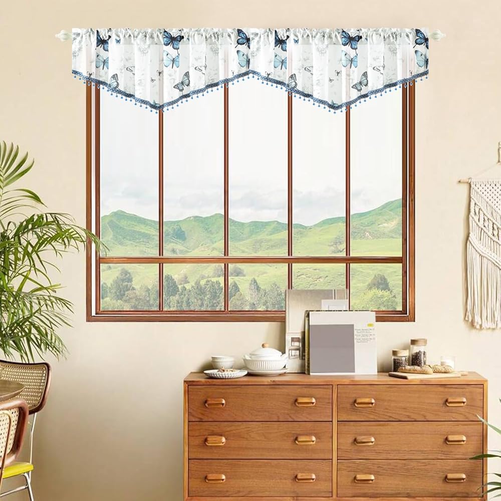 Leeva Blue Butterfly Valances for Windows - Farmhouse Floral Print Voile with Crystal Bead Trim, Elegant Rod Pocket Valance for Living Room & Cafe, 52" W x 16" L