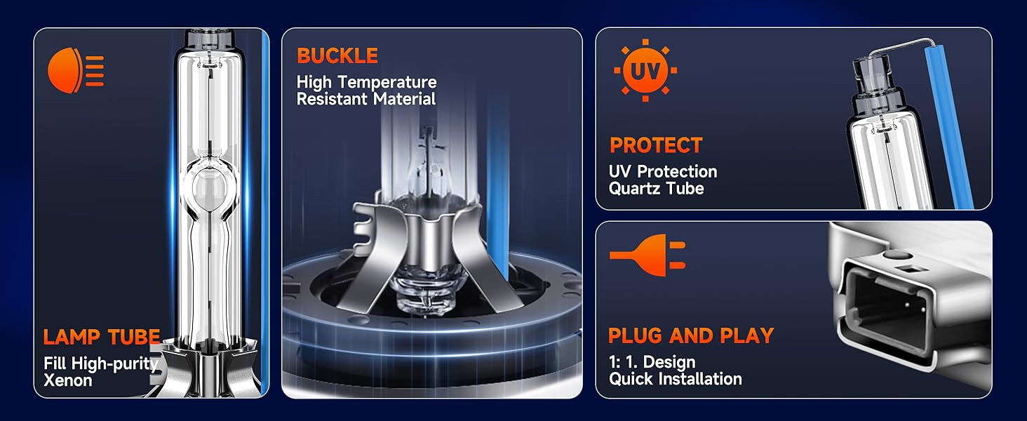 【Service Life of 3500 Hours】SENROBO xenon headlight bulbs are made of 100% quartz UV resistant glass, high-purity xenon gas, high-temperature resistant material, stainless steel metal bracket, and ceramic insulation tube. It is sturdy and durable, with a lifespan of up to 3500 hours, reducing the frequency of replacing xenon bulbs. It is IP68 waterproof and can operate stably in extreme weather conditions such as rainy, foggy, and dust storms