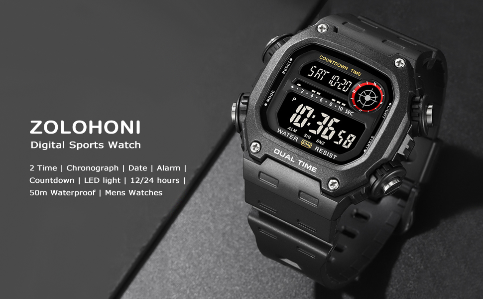 【Multifunctional Sports Watch】This Zolohoni digital watch boasts a range of practical features, including Dual Time Zone displays, Chronograph, 12/24-hour format switch, Date, Week, EL light, Alarm, Countdown Timer, Snooze function, Water Resistance, and Shock Resistance. Its versatility makes it suitable for a variety of outdoor and indoor sports like running, climbing, and fishing, catering to both professional and leisure activities.