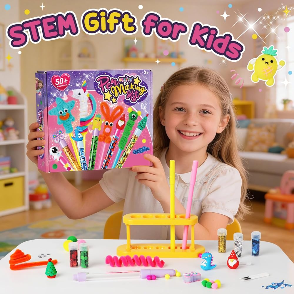 All-in-One Complete Kit: Create 12 unique pens with 50+ craft supplies: pen barrels, ink refills, glitter, beads, pipe cleaners, pom-poms, funnel, tweezers and display stand. Everything a beginner needs for hours of creative DIY fun—no extra tools required