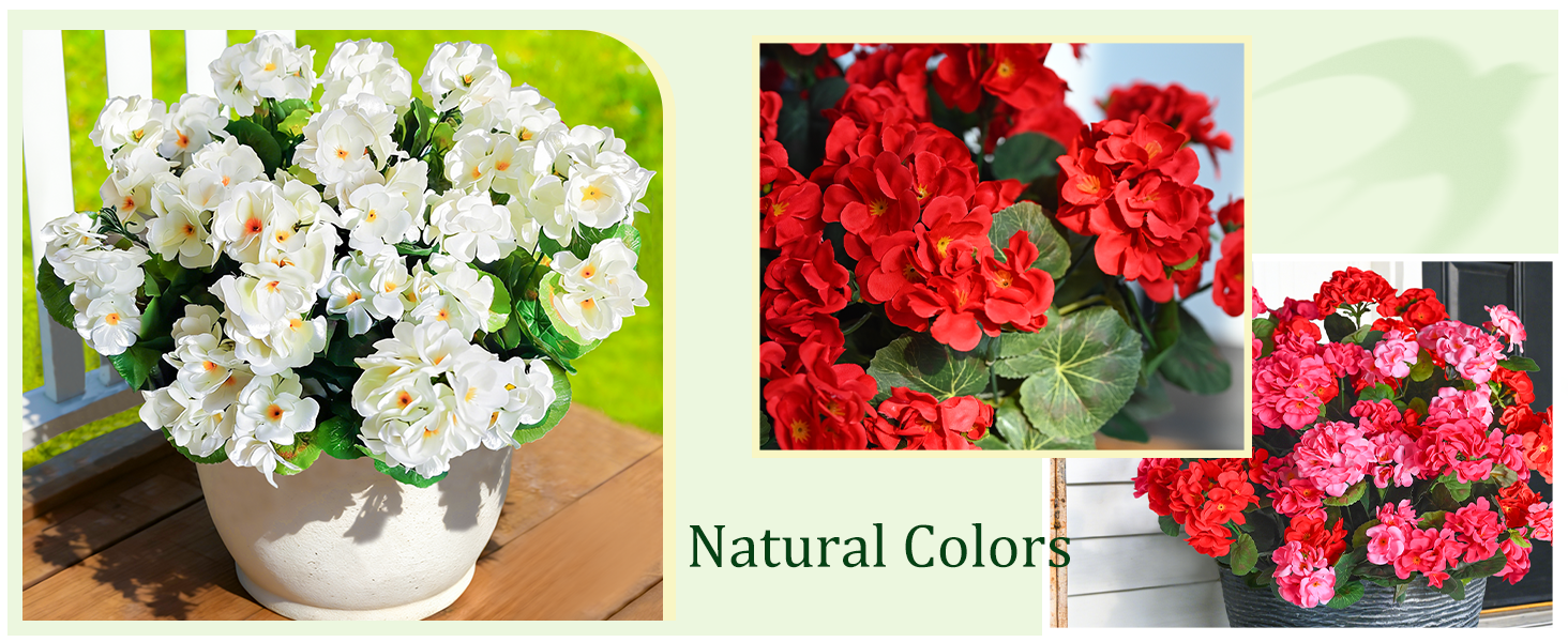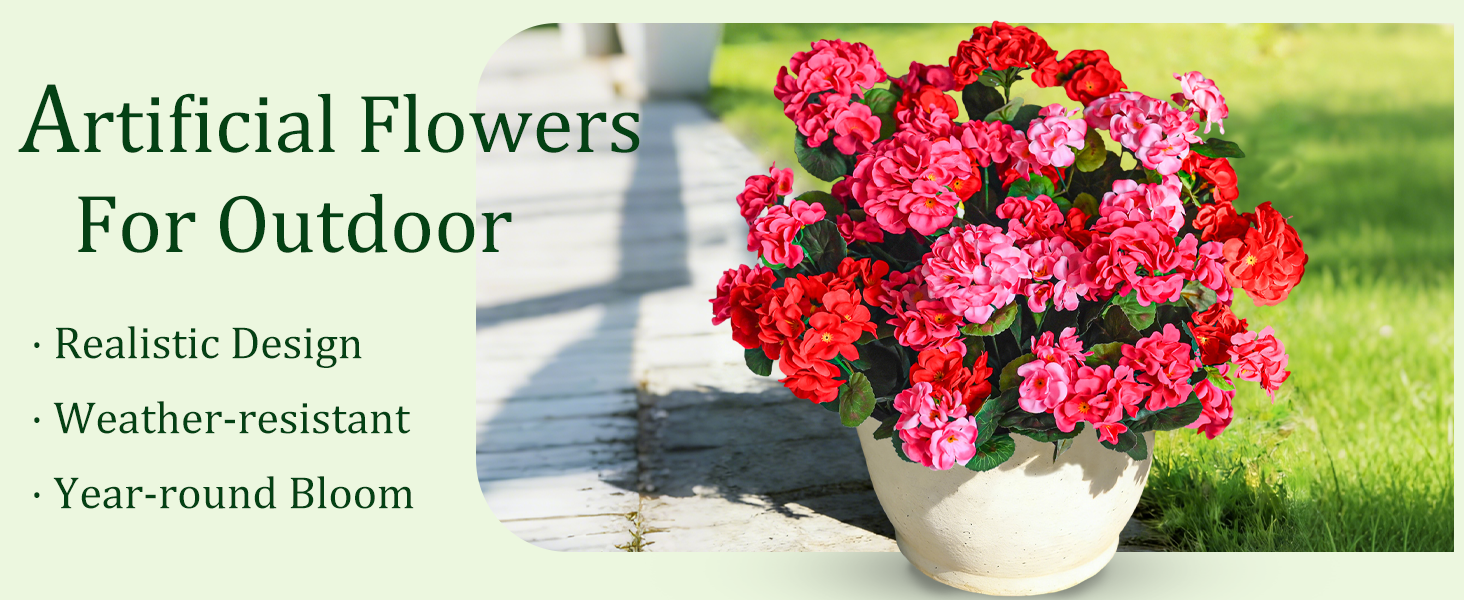 REALISTIC & FULL BLOOMS: Each fake outdoor artificial flower is designed to look lifelike with full, vibrant petals that mimic the natural beauty of real geraniums.