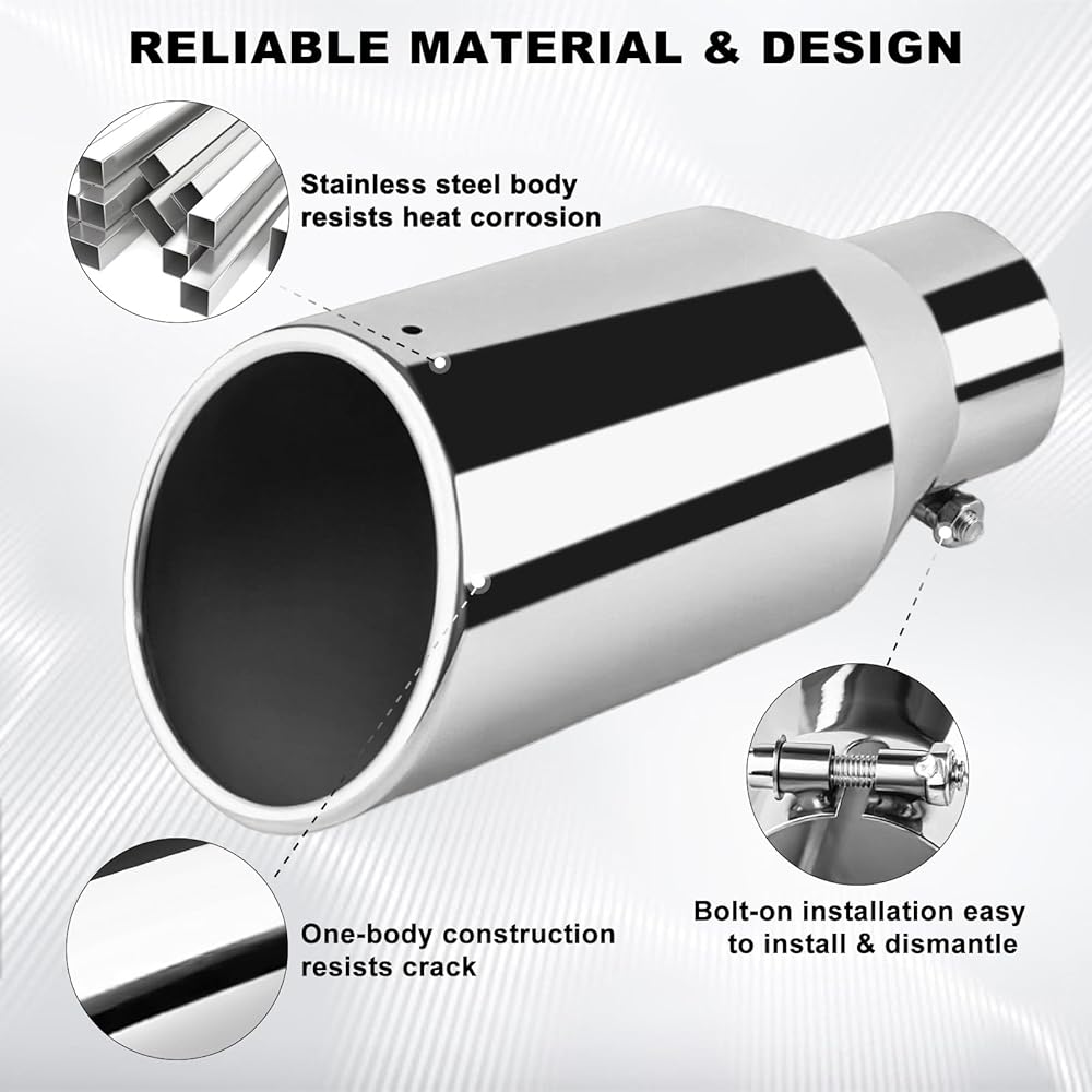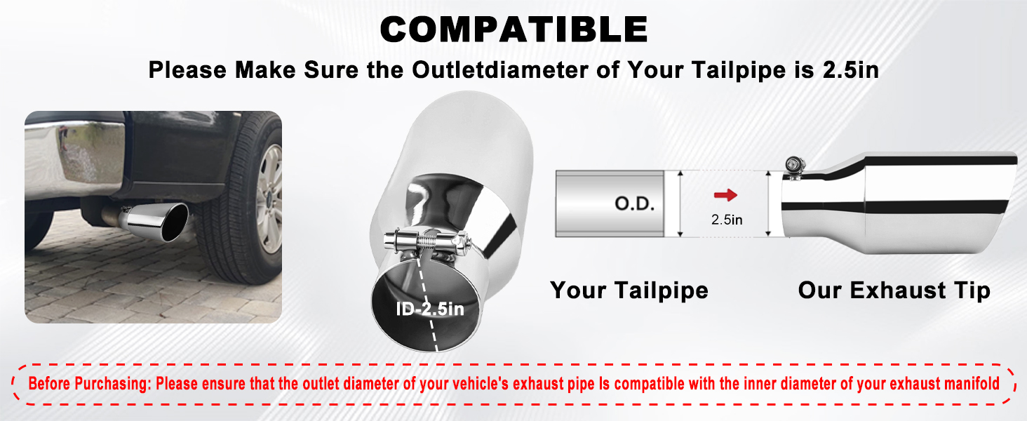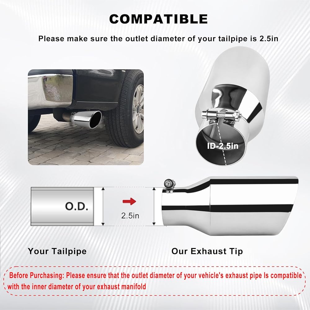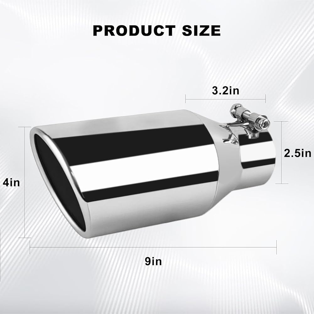 Dimension: This exhaust tip features a 2.5" inlet and a 4" outlet, 9" overall length, giving your car a sleek and professional appearance. Designed for 2.5" outer diameter tailpipe, this exhaust tip install with its bolt-on design(Outside diameter less than 2.5")