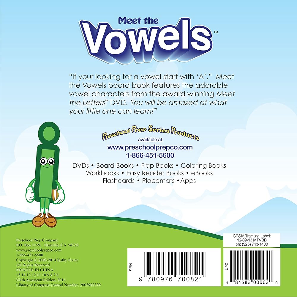 Meet the Vowels with this delightful board book, the newest in the Preschool Prep SeriesTM. Children will have fun meeting the vowels while trying to find where they are hiding. Letters are memorable characters from the award-winning Meet the LettersTM DVD. You will be amazed at what your little one can learn!TM