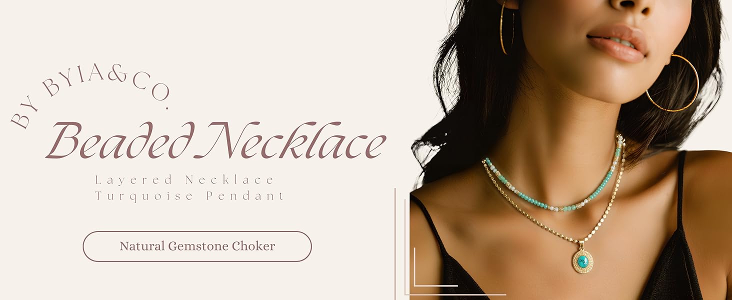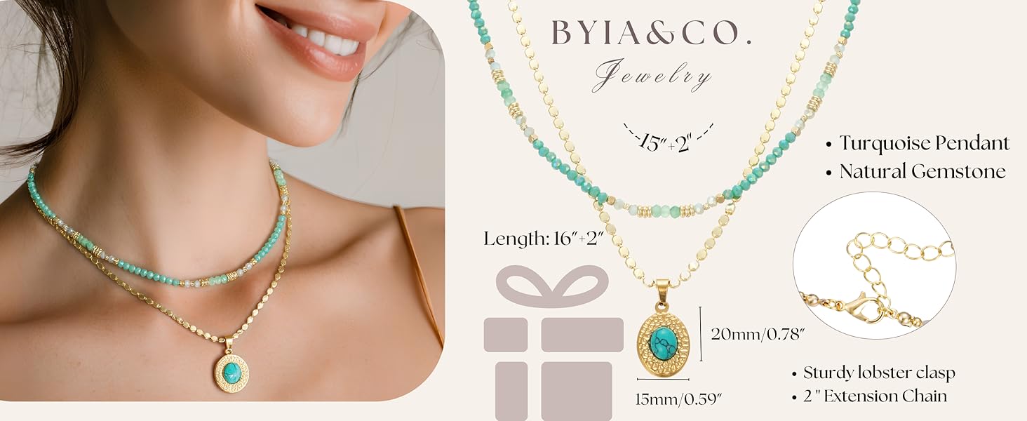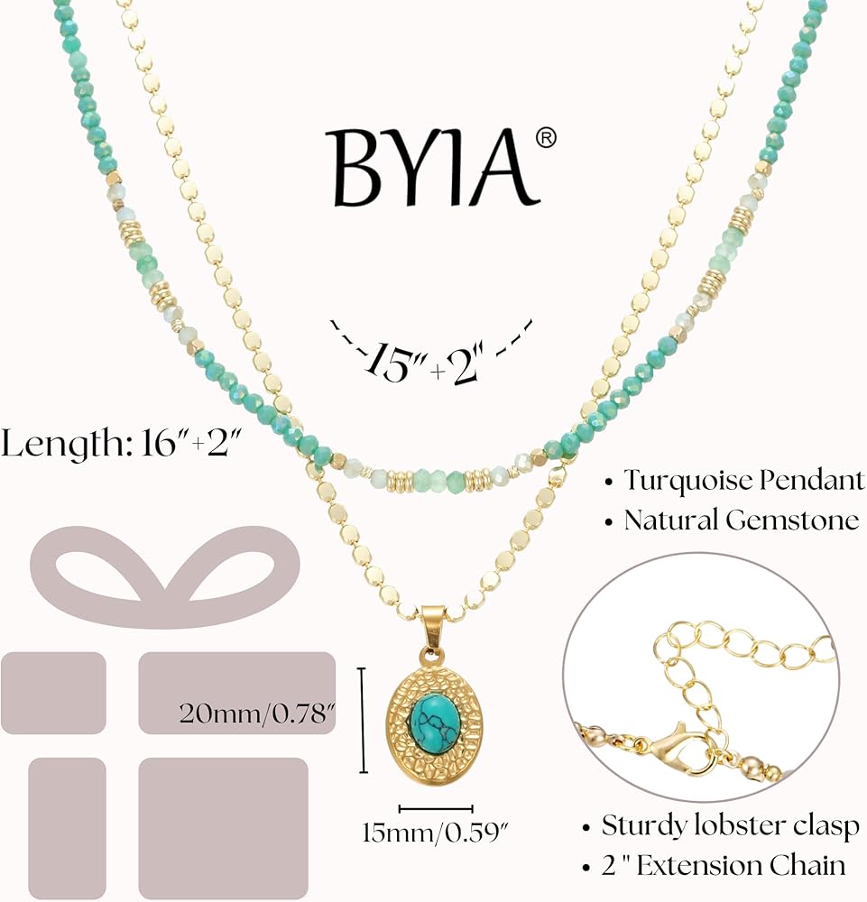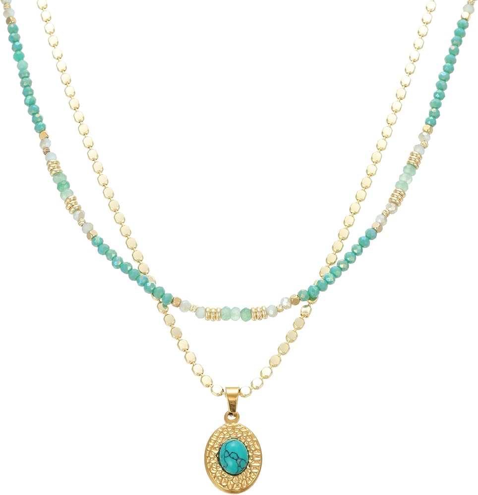 Bohemian Design: This stunning layered necklace combines a choker of green natural stone beads with a second layer featuring a gold chain and a vintage-style turquoise pendant