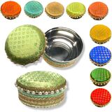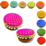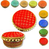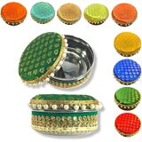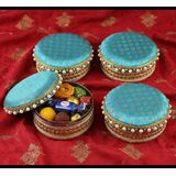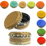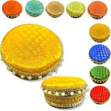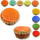 Stainless Steel Gift Box: Add Sparkle to your Celebration with this Pretty Looking Round Stainless Steel Box. The Lid is handmade and Embellished with Bright Colored Fabric and Pearls. This Versatile Box can be used for Sweets, Dry Fruits, Mithai, Chocolates, Candies, or any other Gift Items for all Occasions and Purposes.