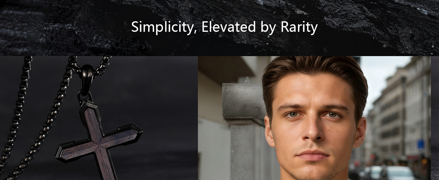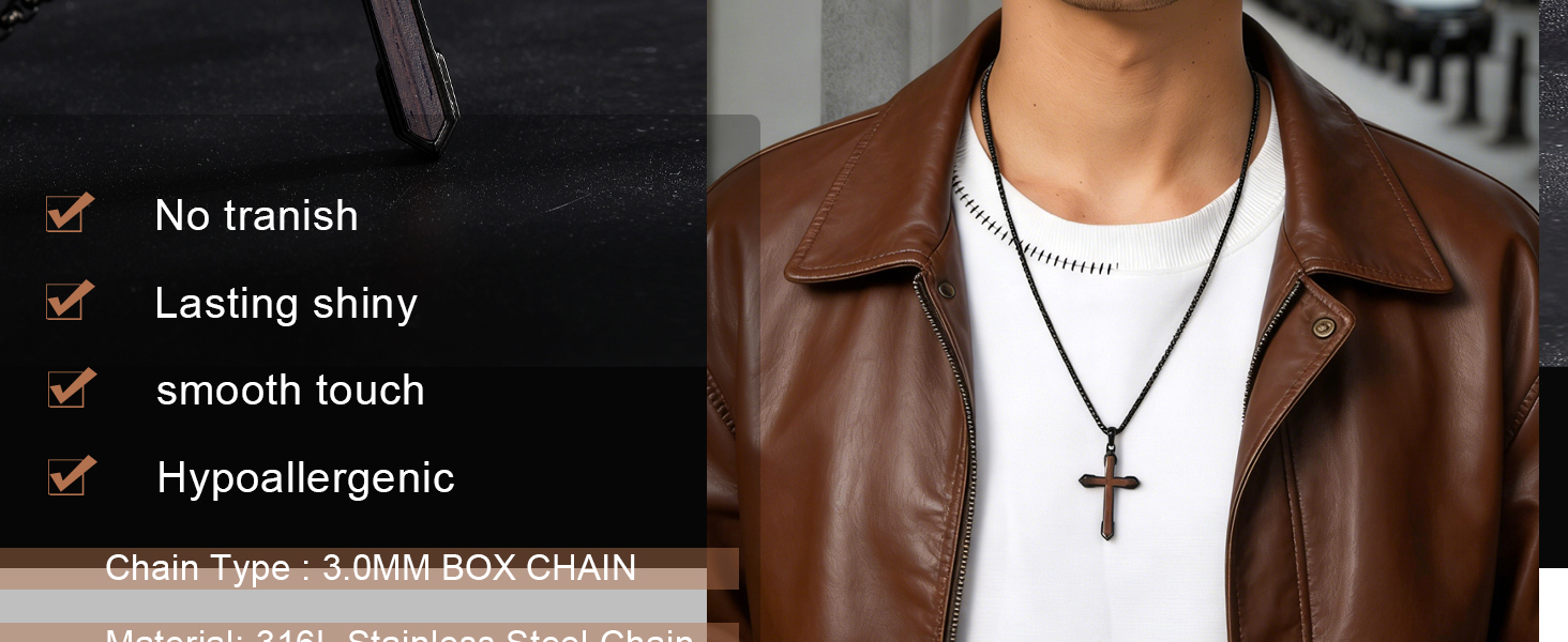 This distinctive wooden cross necklace for men combines spiritual symbolism with everyday wearability. Crafted from stainless steel with a black finish and yellow gold decorative plating, this piece features a unique wooden cross pendant that adds natural warmth to the design. The 316L stainless steel construction ensures durability and resistance to tarnishing, making it ideal for daily wear. The adjustable box chain ranges from 24 to 26 inches in length, allowing you to customize the fit to your preference, and secures with a reliable lobster claw clasp. At 3 millimeters thick, the pendant strikes the perfect balance between presence and comfort. This versatile piece works beautifully as casual wear and makes a thoughtful spiritual jewelry gift for him. Whether worn alone or layered with other pieces, this cross necklace adds meaningful style to any outfit. The timeless design appeals to men seeking jewelry that reflects their faith while complementing their personal style.
