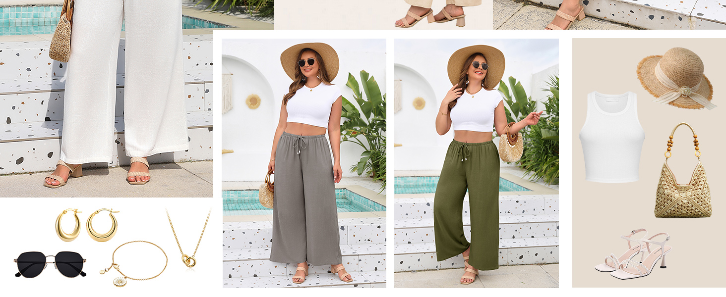 Summer boho wide leg pants crafted from breathable linen, plus size summer outfits.