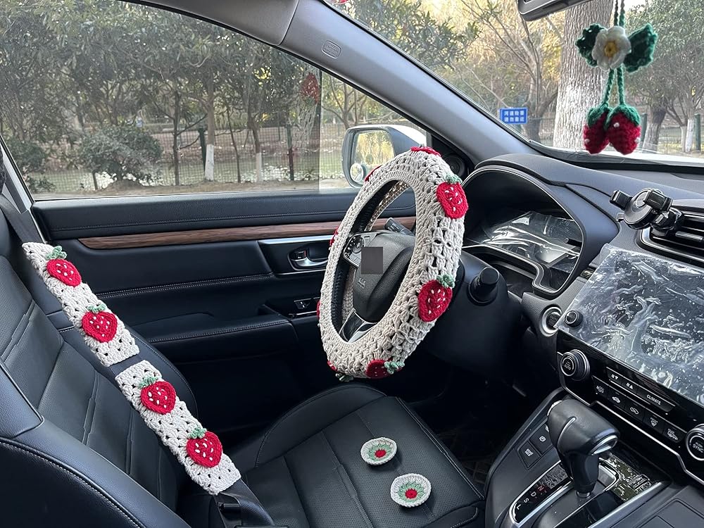 Handmade crochet strawberry steering wheel cover,seat belt cover,new style,it is very lovely and cozy,