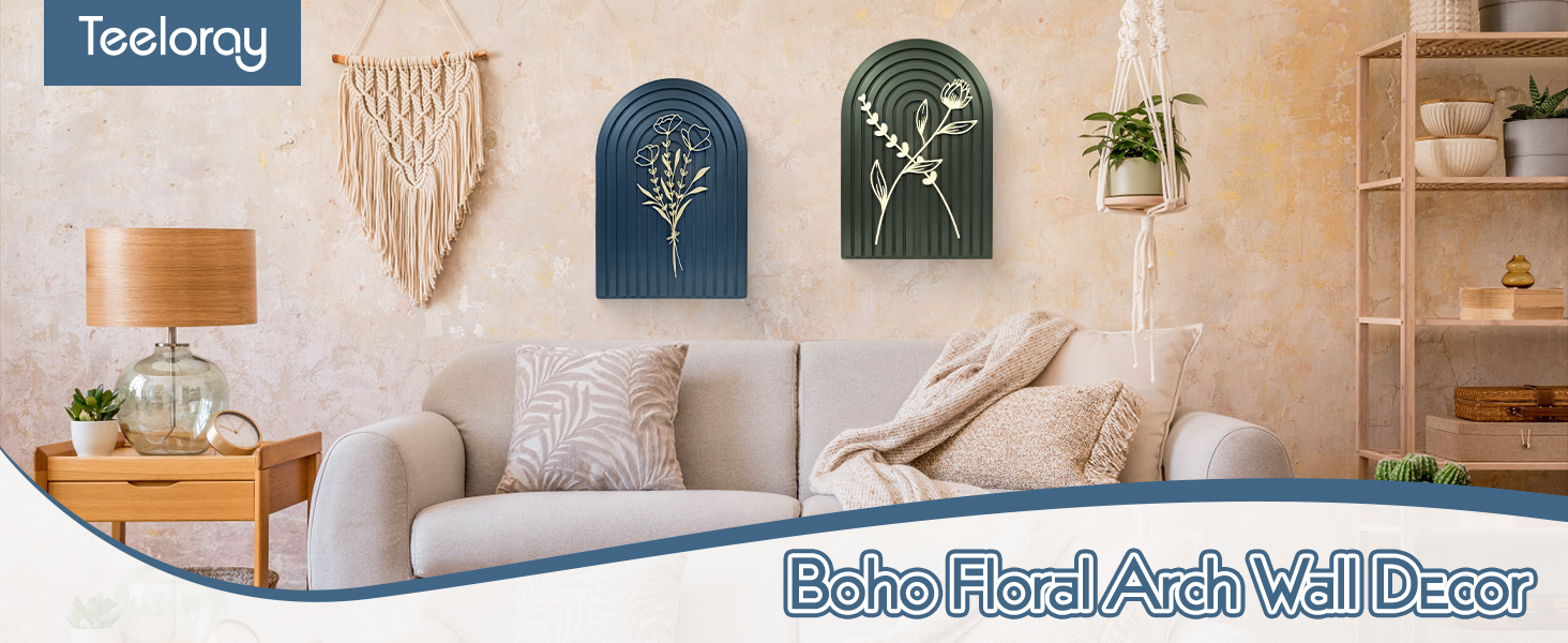 Teeloray Boho Wall Decor Wooden Arch Floral Mid Century Modern Shelf Decor Aesthetic Bohemian Art Wall Hanging Decor with 3D Hollow Craft Minimalist Wall Art for Bookshelf Living Room Bedroom