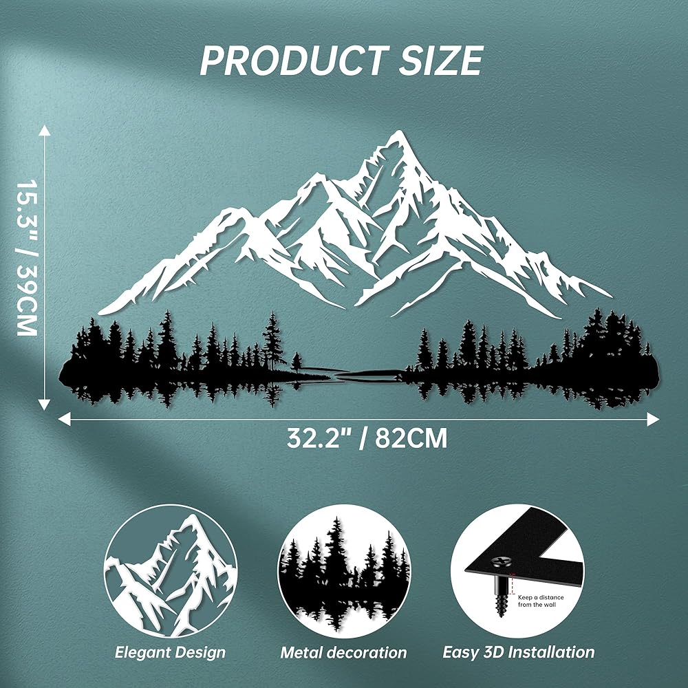 Enhance your space with this elegant Metal Mountain Wall Art featuring a serene landscape of snow-capped peaks against a forest silhouette. This piece captures the timeless beauty of nature in a modern, artistic design that complements any decor style.