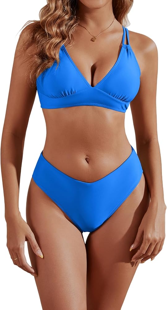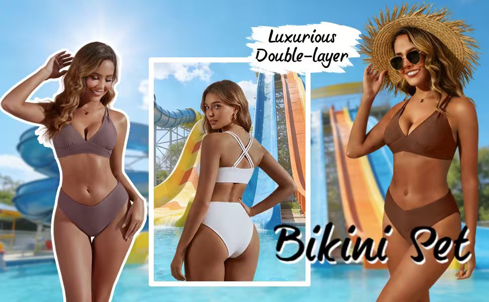 Feature:This two piece swimsuit with double layer fabric,full lined,stretchy,pro-skin,durable,makes it easy and very comfortable to wear.Crisscross back push up bikini top and high cut bottom.Top with adjustable double straps, criss cross back,and removable push-up pads for added support and good to cover your body.high cut style make you look slim, sexy and unique,show you more flattering.