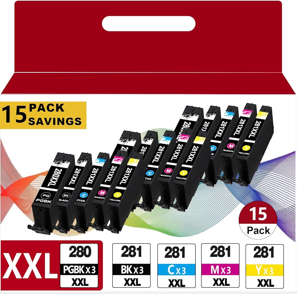 1. Complete 15-Pack Ink Set Replacements for TR8620a ink cartridges include a total of 15 high-capacity 280XXL & 281XXL cartridges: 3× PGI-280XXL (Large Black), 3× CLI-281XXL Black, 3× CLI-281XXL Cyan, 3× CLI-281XXL Magenta, 3× CLI-281XXL Yellow—ideal for heavy printing needs.
