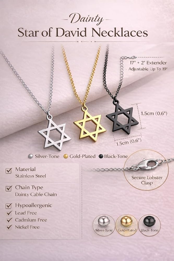 ✨ Majestic Jewish Symbol in Three Stunning Colors : Embrace the timeless beauty of the Shield of David with our Star of David pendant. Available in classic black, elegant gold, and timeless silver, this symbol of courage resonates with the essence of David, a man after God's heart, and serves as an inspiring addition to your jewelry collection.