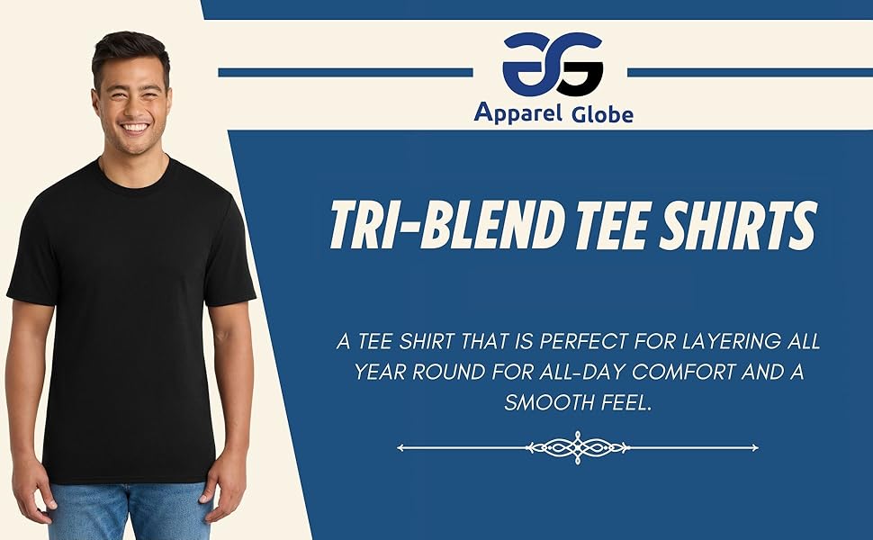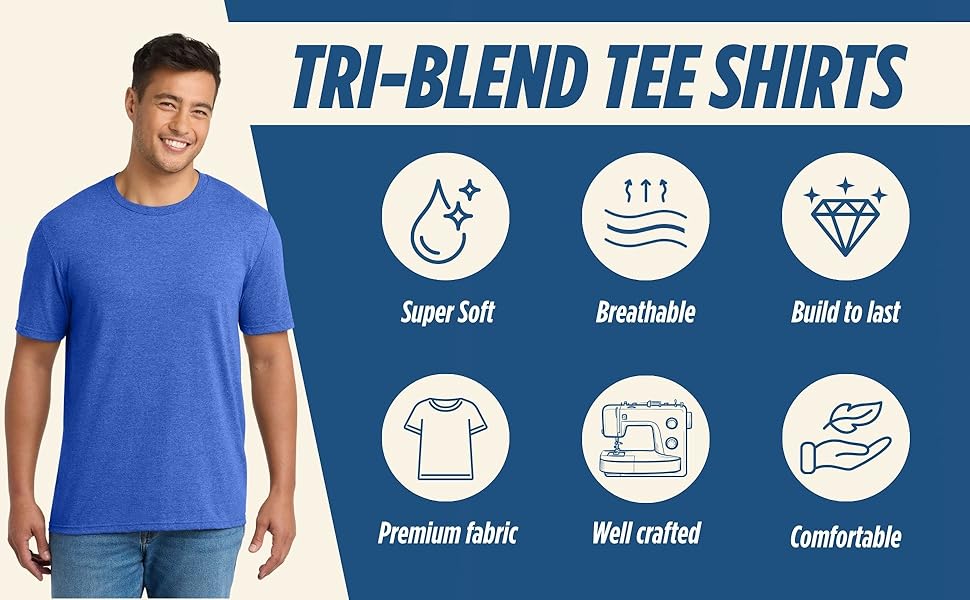 - 4.5-ounce tri-blend fabric of 50/37/13 poly/cotton/rayon offers lightweight comfort and durability