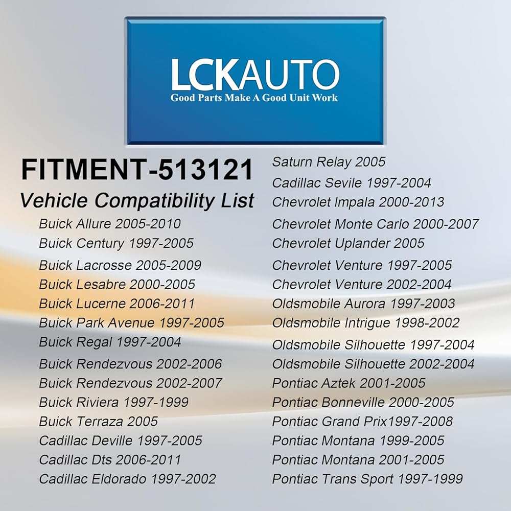 Compatibility Vehicle: 513121 Compatible with BUICK Allure 05-10, CENTURY 97-05, LaCrosse 05-09, LESABRE 00-05, Lucerne 06-11, PARK AVENUE 97-05, REGAL 97-04, RENDEZVOUS 02-07, RIVIERA 97-99, Terraza 05, for CADILLAC DEVILLE 97-05 DTS 06-11 ELDORADO 97-02 SEVILLE 97-04, for CHEVY IMPALA 00-13, MONTE CARLO 00-07, Uplander 05, VENTURE 97-05, for OLDSMOBILE AURORA 97-03, INTRIGUE 98-02,SILHOUETTE 97-04, AZTEK 01-05, BONNEVILLE 00-05 GRAND PRIX 97-08 MONTANA 99-05 TRANS SPORT 97-99, for SATURN Relay 05.