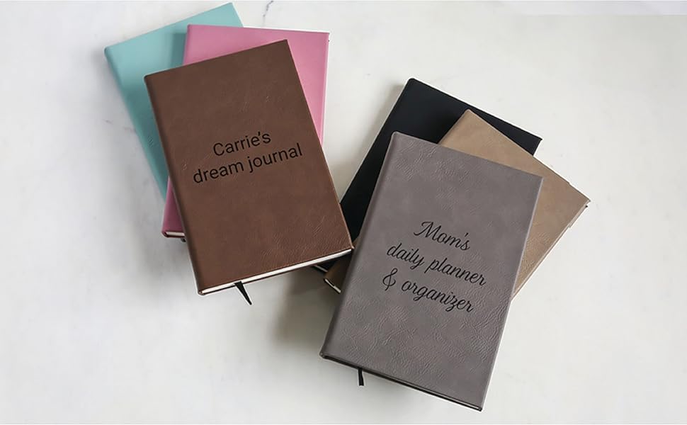 Customizable: click "customize now" to have up to 3 lines, 14 characters each laser engraved in the center of the notebook as shown in the sample photo; choose from various fonts; all text is the same size