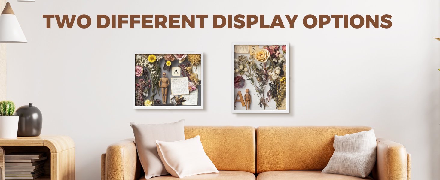 Magnetic doors are very convenient to open and close, so you can easily update your unique artwork anytime, anywhere. This 16x20" shadow box frame comes ready to hang on a wall for display in both horizontal and vertical or proudly displayed on a desktop, tabletop, or mantel