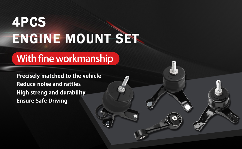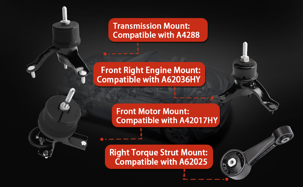 Package Included: Motor Mount - Front X1 Motor Mount - Right X1 Torque Strut Mount - Right UpperX1 Transmission Mount - LeftX1