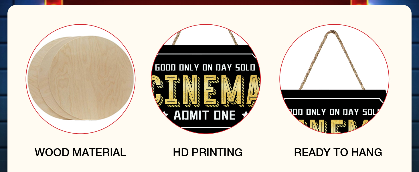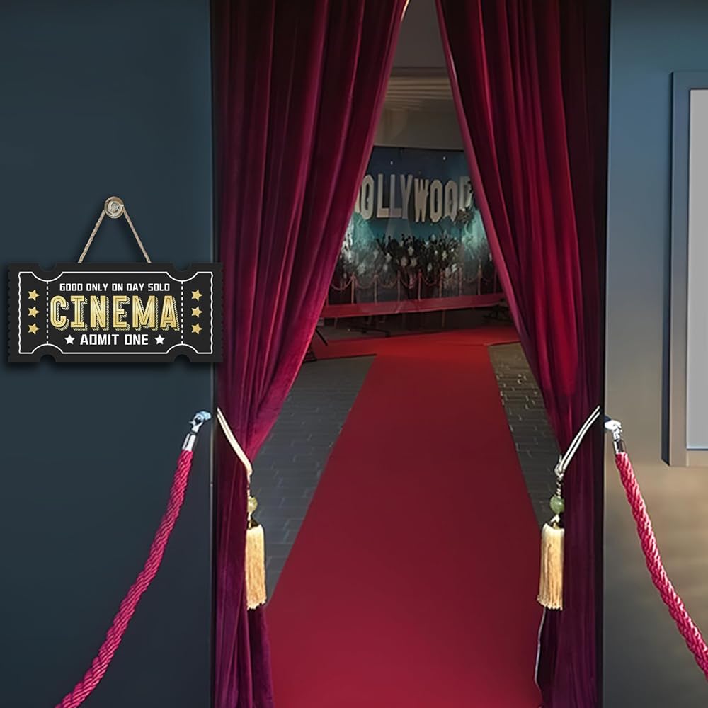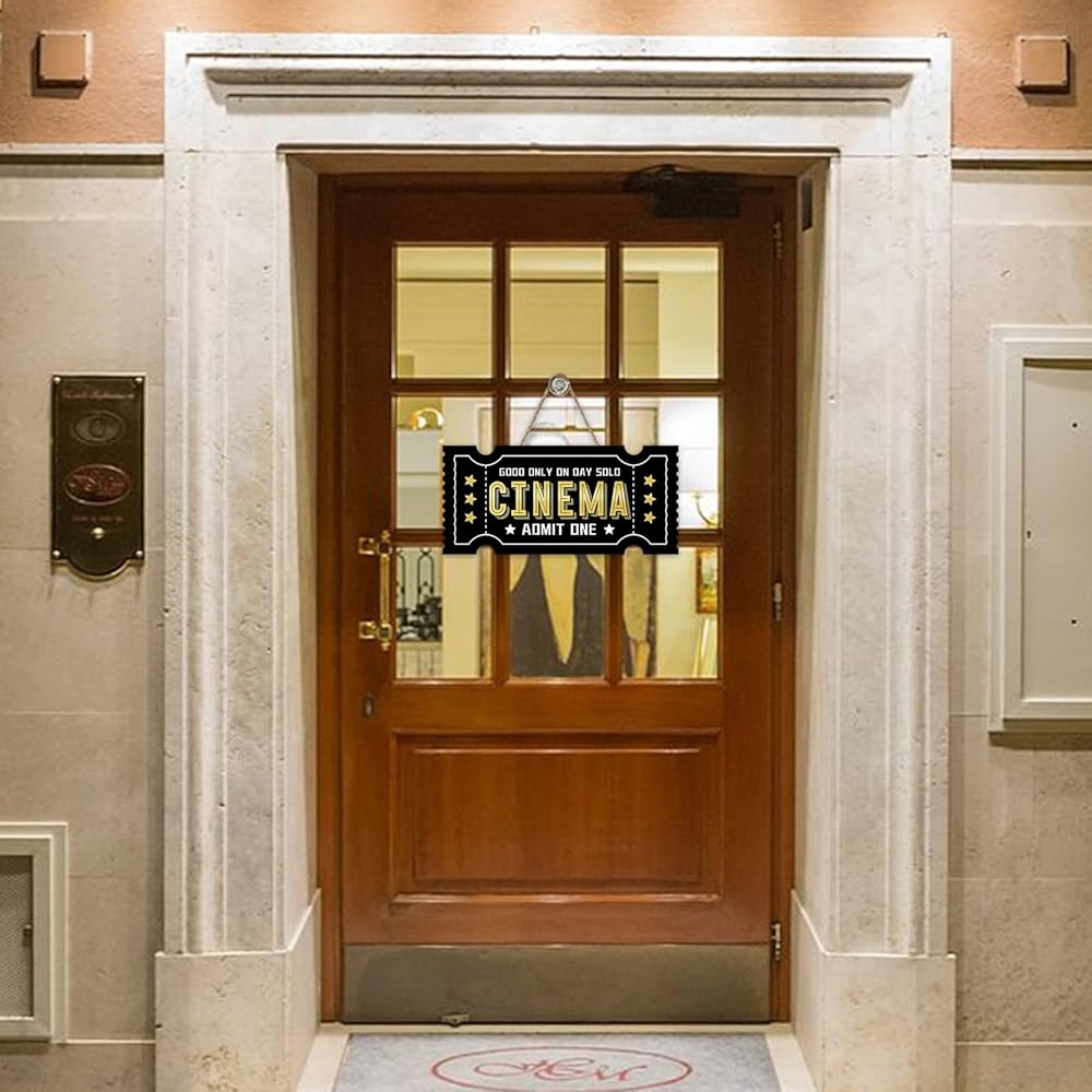 Vintage Cinema Ticket Front Door Sign, Retro Black Gold Wood Plaque Hanger Film Theater Movie Room Home Decor, Wooden Wreath Indoor Wall Hanging Decoration Movie Lover Gift