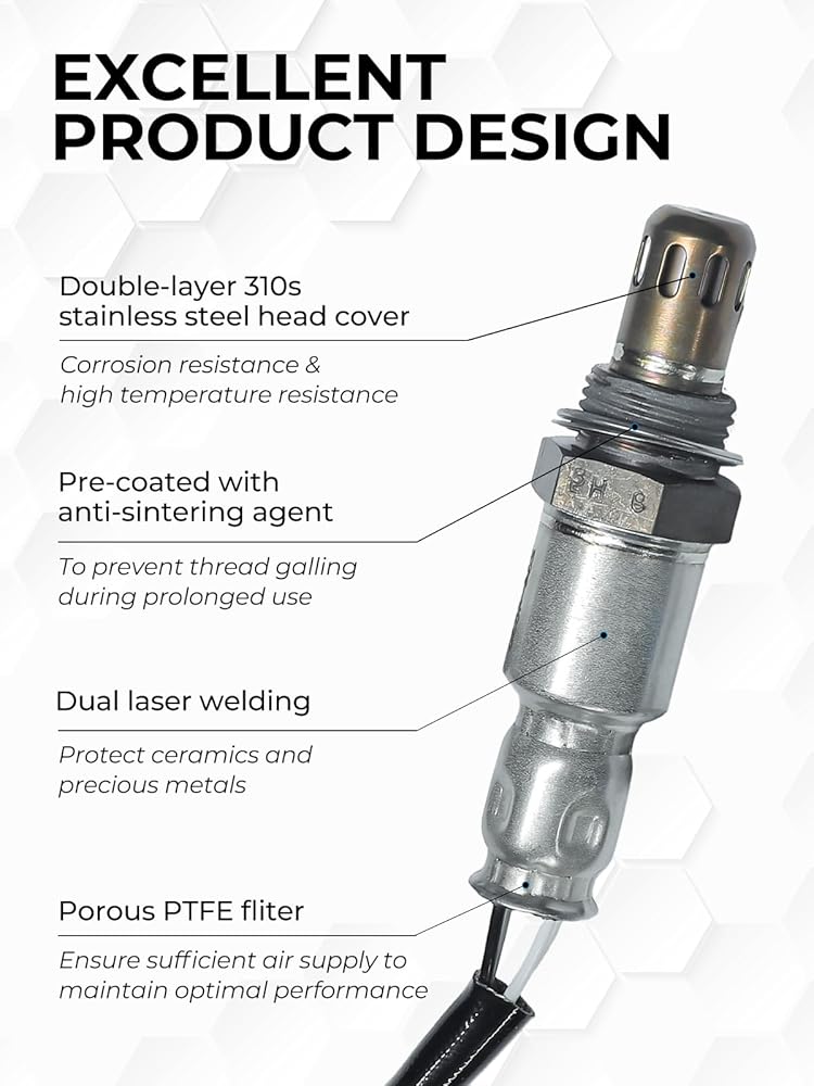 【Product Features】The oxygen sensor features high-quality ceramic components and precious metal-coated electrodes, delivering precise and rapid oxygen concentration detection. The housing is made of high-temperature-resistant 310S stainless steel, offering excellent corrosion resistance and durability. Pre-applied anti-seize coating on the threads allows for direct installation.