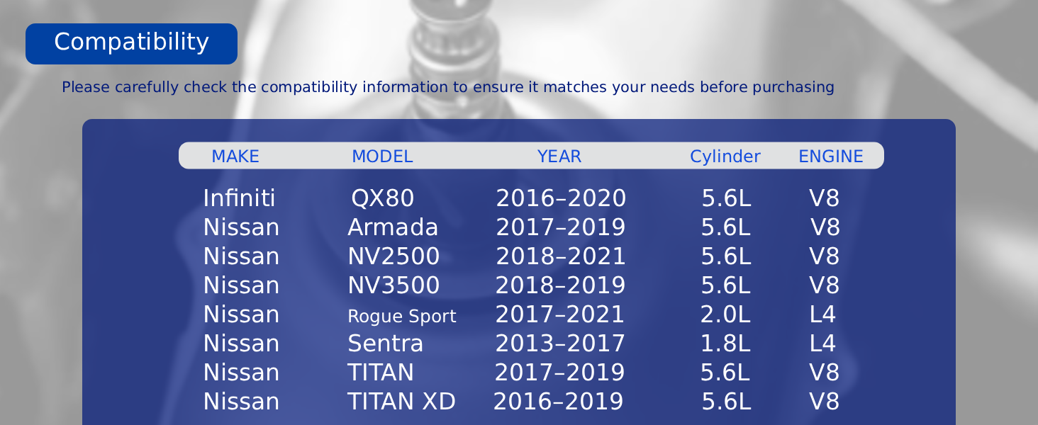 - [Vehicle Fitment]: Compatible with QX80 2016-2020 V8 5.6L (From 08/2015; To 09/2019); Armada 2017-2019 V8 5.6L, NV2500 2018-2021 V8 5.6L, NV3500 2018-2019 V8 5.6L, Rogue Sport 2017-2021 L4 2.0L (B1S2), Sentra 2013-2017 L4 1.8L (B1S2), TITAN 2017-2019 V8 5.6L, TITAN XD 2016-2019 V8 5.6L