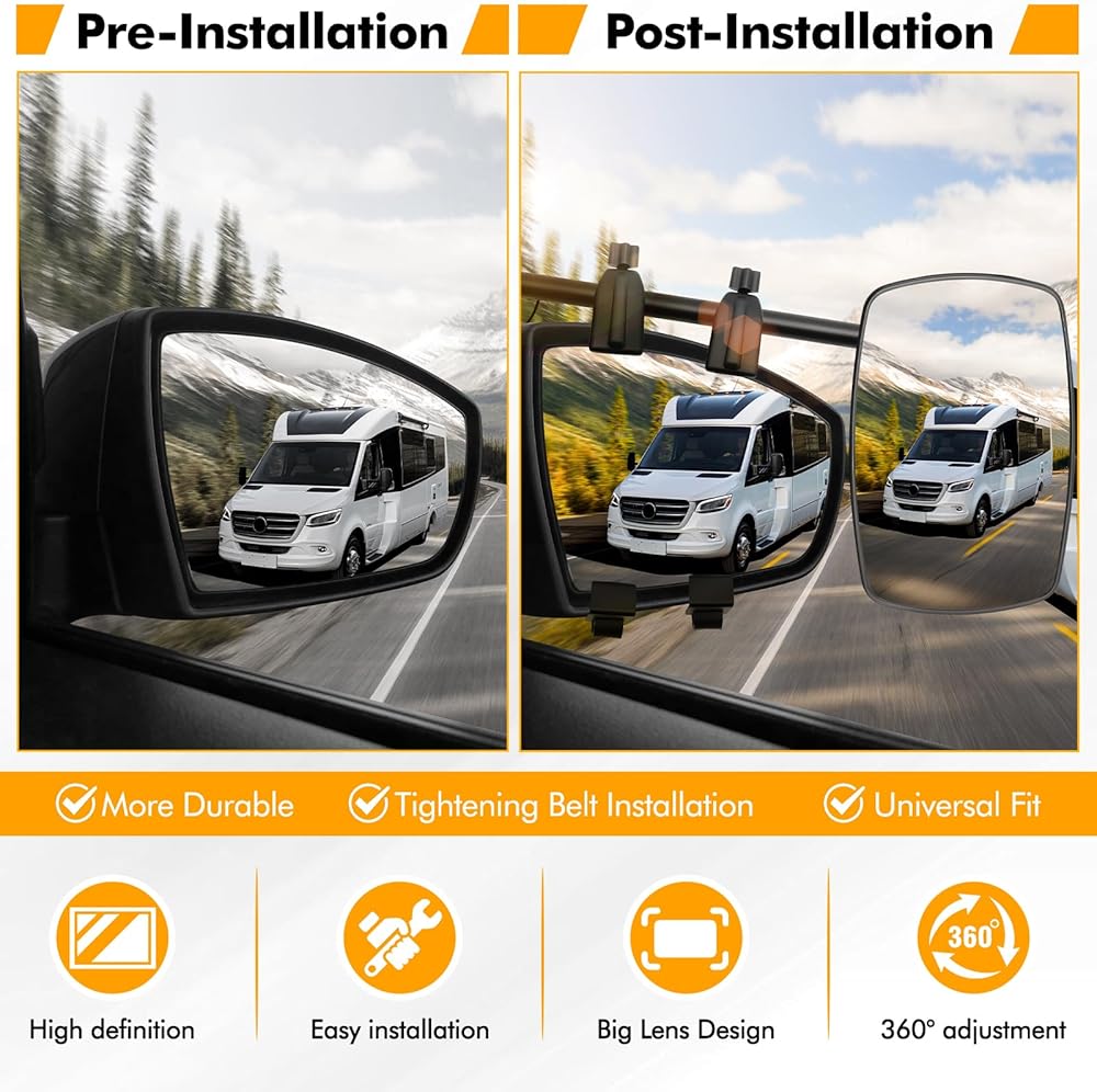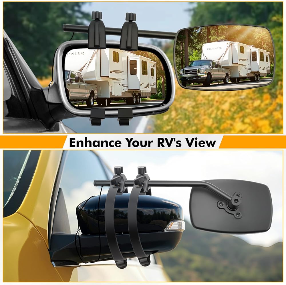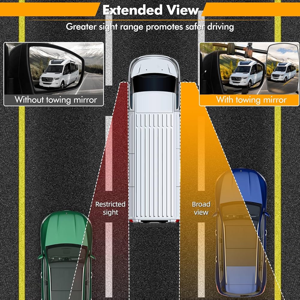 HIGH MATERIAL TOWING MIRROR EXTENSION: Our rv mirrors for towing is composed of ABS plastic shell, high-definition glass, metal mirror pole. Stronger, harder, non-deformable and not easy to break. the glass is high clear for provide a beautiful view. The longer arm enables an even better field of vision to help avoid obstructions. The method of reinforcing buckles can effectively reduce vibration during driving. It will not be easily damaged even in bad weather conditions such as heavy rain, snow and wind