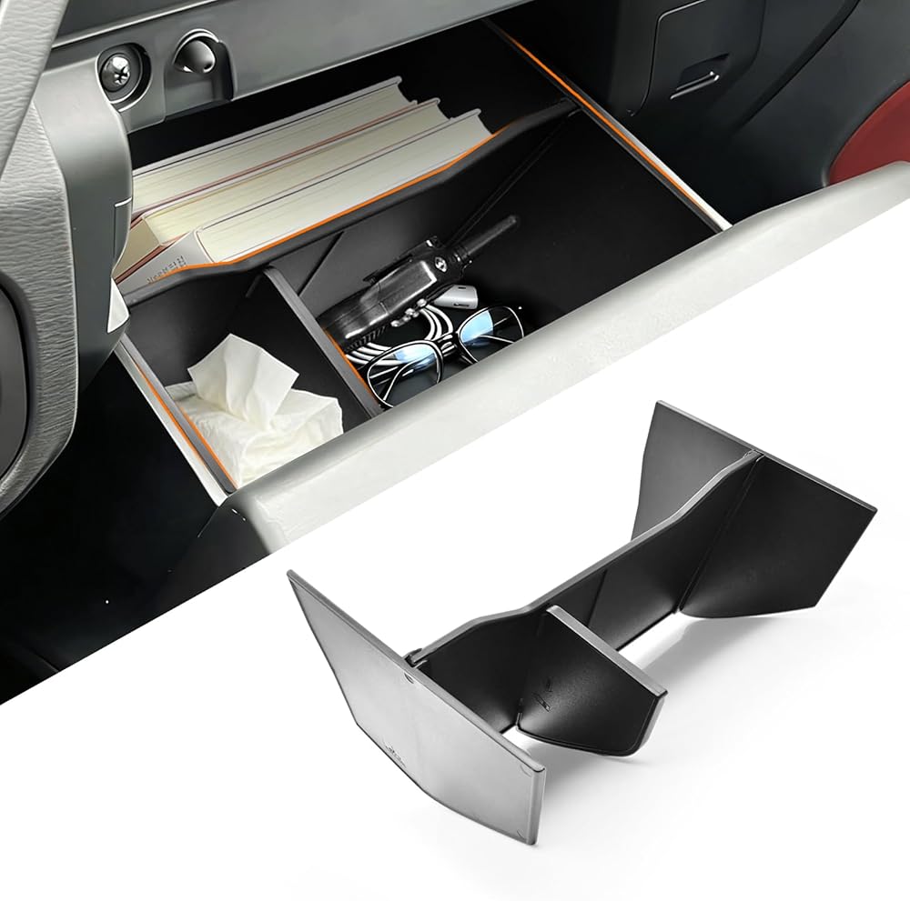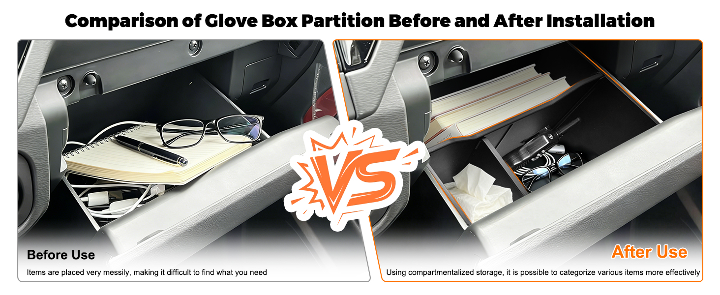 Separate Storage: This glove compartment divider is designed with sections, allowing for better organization of items according to personal needs, such as manuals and notebooks. The large size compartment can fit the owner's manual