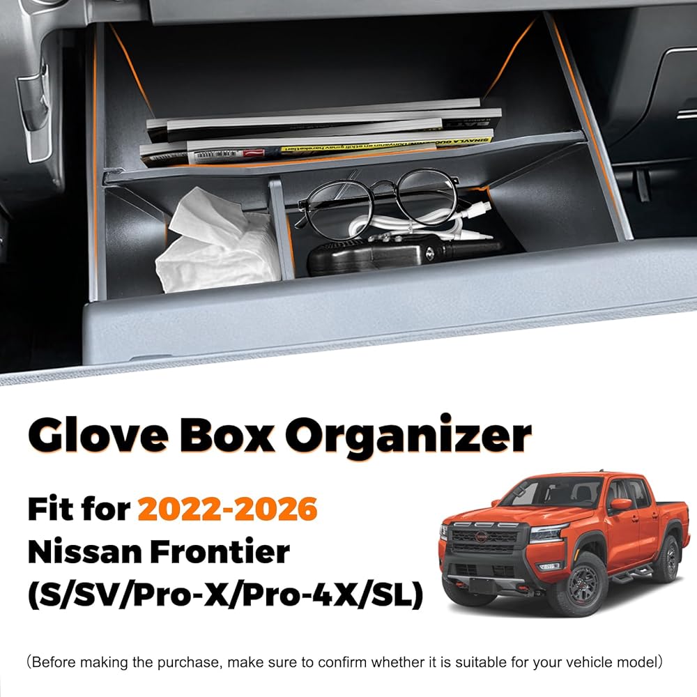 Perfect Fit: This glove compartment organizer fit for 2022-2026 Nissan Frontier (S/SV/Pro-X/Pro-4X)/2024 2025 Frontier SL Pickup Truck Accessories,Please double-check the model before purchasing