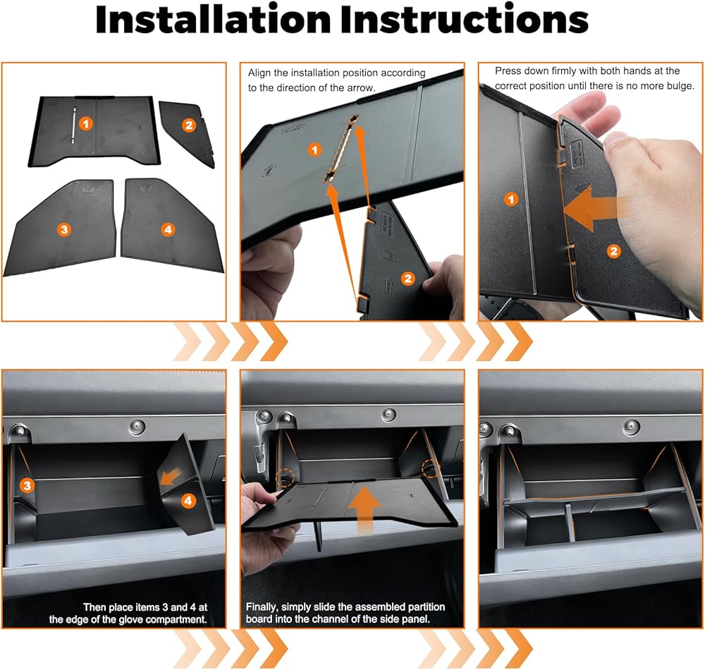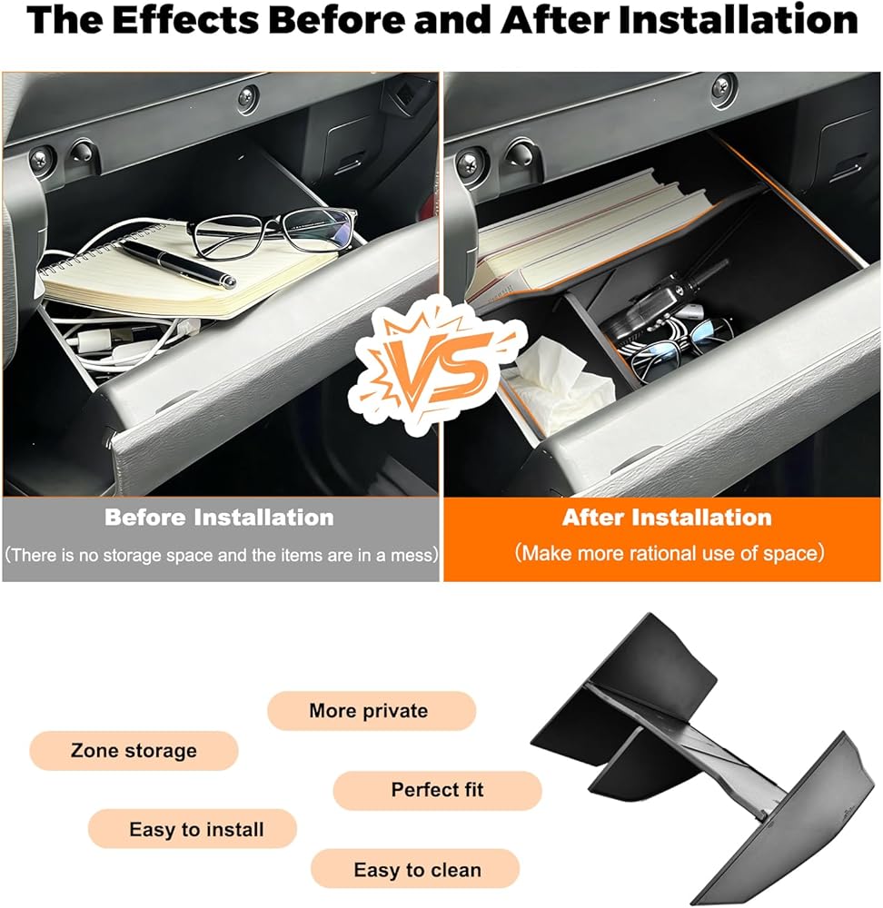 Installation is Simple: No tools required. Just align the product to the correct position, assemble it, and insert it into the glove box. Additionally, we have provided an installation manual. If you have any doubts about the product, please contact us promptly through the Amazon platform