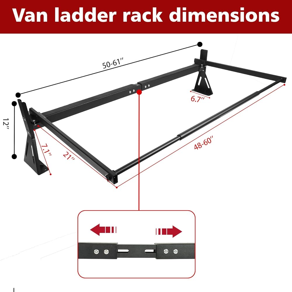 Adjustable Length: 50–61 inchesFits flat roof tops with adjustable length from 50 to 61 inches, such as Ford Transit 150/250/350 and enclosed trailers. Drilling is required for installation.