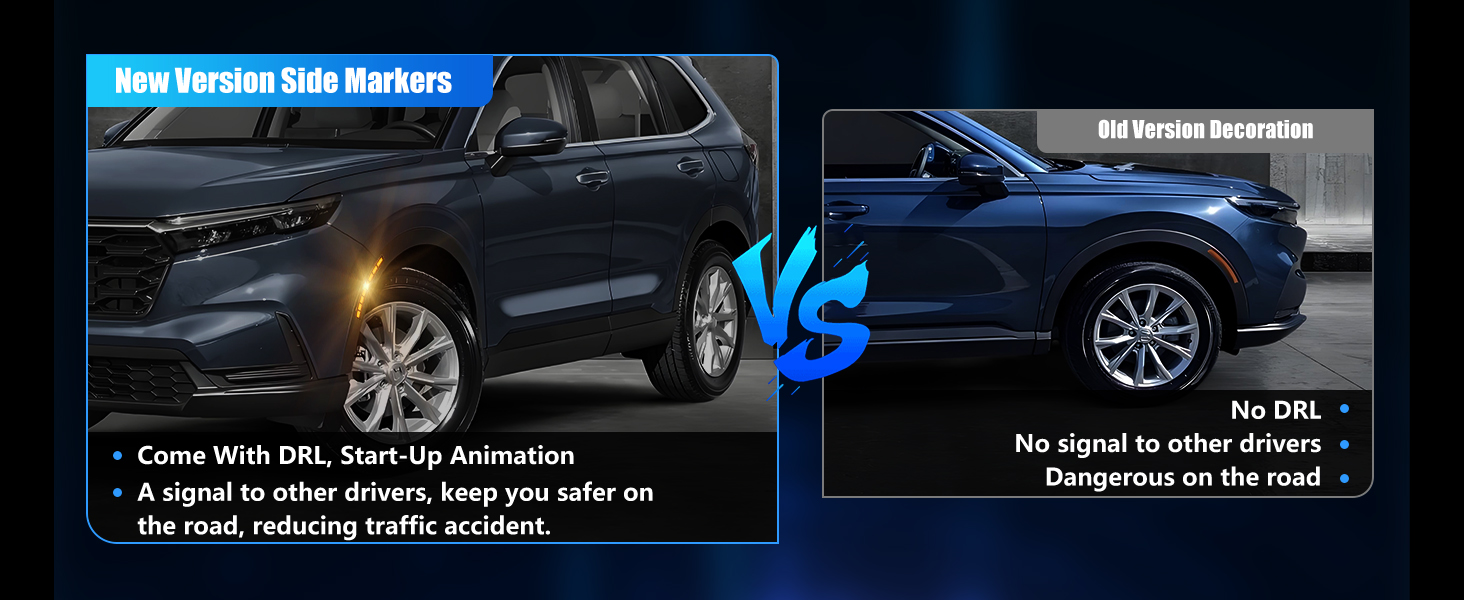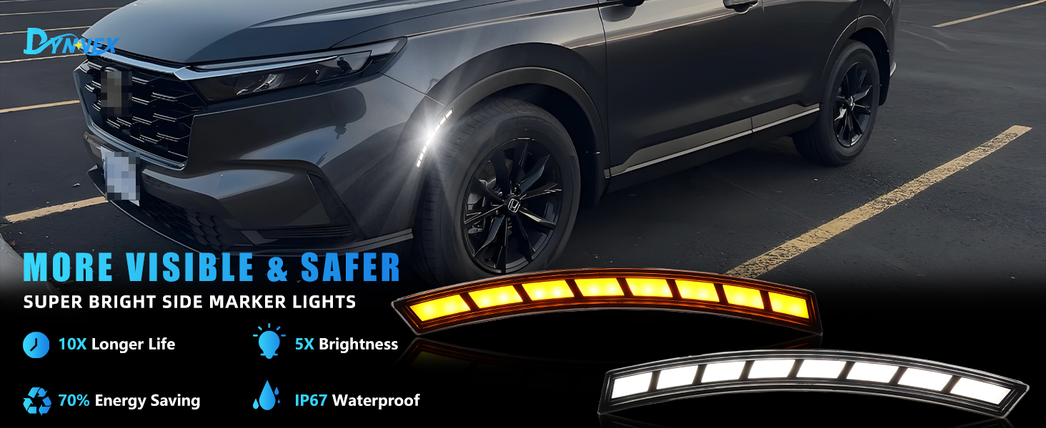 【Precision Fit】The DYNVEX side marker lights are flawlessly compatible with 2023 2024 Hon-da CR-V EX, Sport Hybrid, EX-L, and Sport Touring Hybrid, providing an easy and effective improvement for your car. The lights with high-power SMDs: 3x brighter than standard bulbs, low energy consumption, long-life. Sleek design elevates vehicle look while ensuring steady illumination for safer driving—ideal halogen replacement. Its OEM Part assures an ideal fit, making your journey safer and brighter.