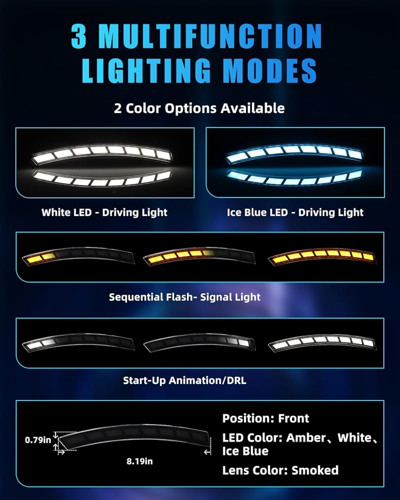 【3 Multifunctional Modes】Two colors of lights can be used as daytime running lights, you can choose one of them. White light or ice blue light as daytime running light; amber sequential flashing light as turn signal light; start-up animation as welcome light. This innovative and modern design serves as a direct replacement, seamlessly integrating these features into your vehicle's aesthetics. With super bright LEDs, they offer a faster on/off response time that reduces the risk of accidents.