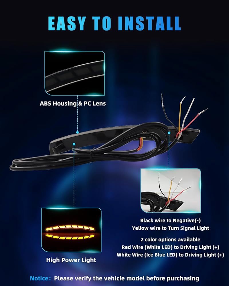 【Easy Install】Connect black wire to Negative, yellow to turn signal. You can choose white or ice blue lights as your daytime running lights, and the corresponding wiring is: red wire (white LED) to driving light (+) or white wire (ice blue LED) to driving light (+). Direct replacement LED lamp with simplified wiring—no complex steps. Upgrades car lighting for unique design and hassle-free driving experience.