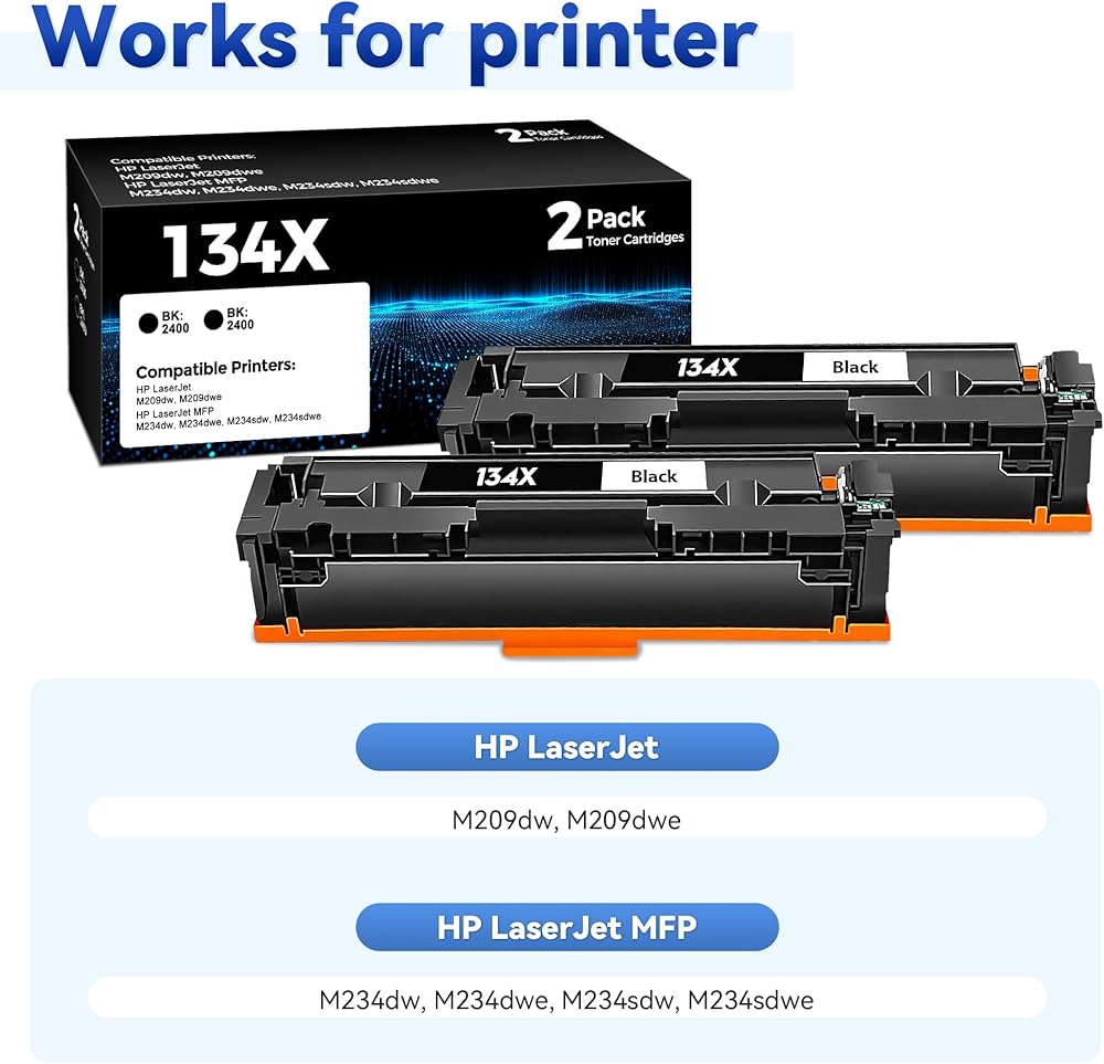 Compatible Printer Models: 134X black toner compatible for HP LaserJet M209dw M209dwe MFP M234dw M234dwe M234sdw M234sdwe.