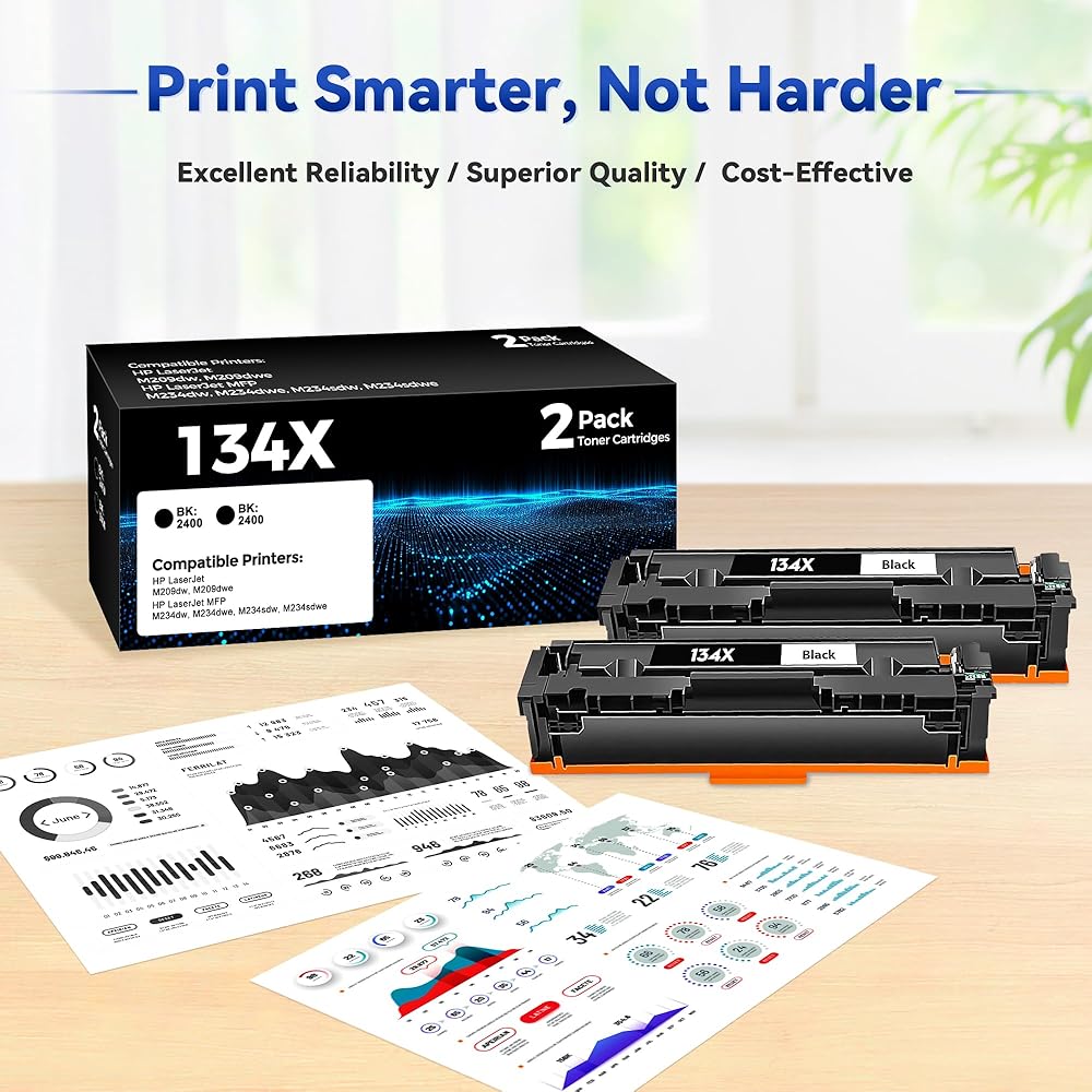 High Yield Toner: 134X black toner cartridge can print up to 2400 pages(Letter/A4, at 5% coverage) 4800 pages totally for 2 packs.