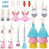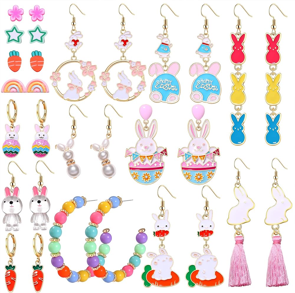 You will get 15 pairs easter earrings,including 4 pairs easter themed clay stud earrings,8 pairs enamel rabbit egg drop earrings,2 pairs easter chick egg carrot hoop earrings and 1 pairs beaded hoop earrings.You won't be able to resist the colorful and sparkle of these cute easter jewelry.Delight the senses and step into your happy face.