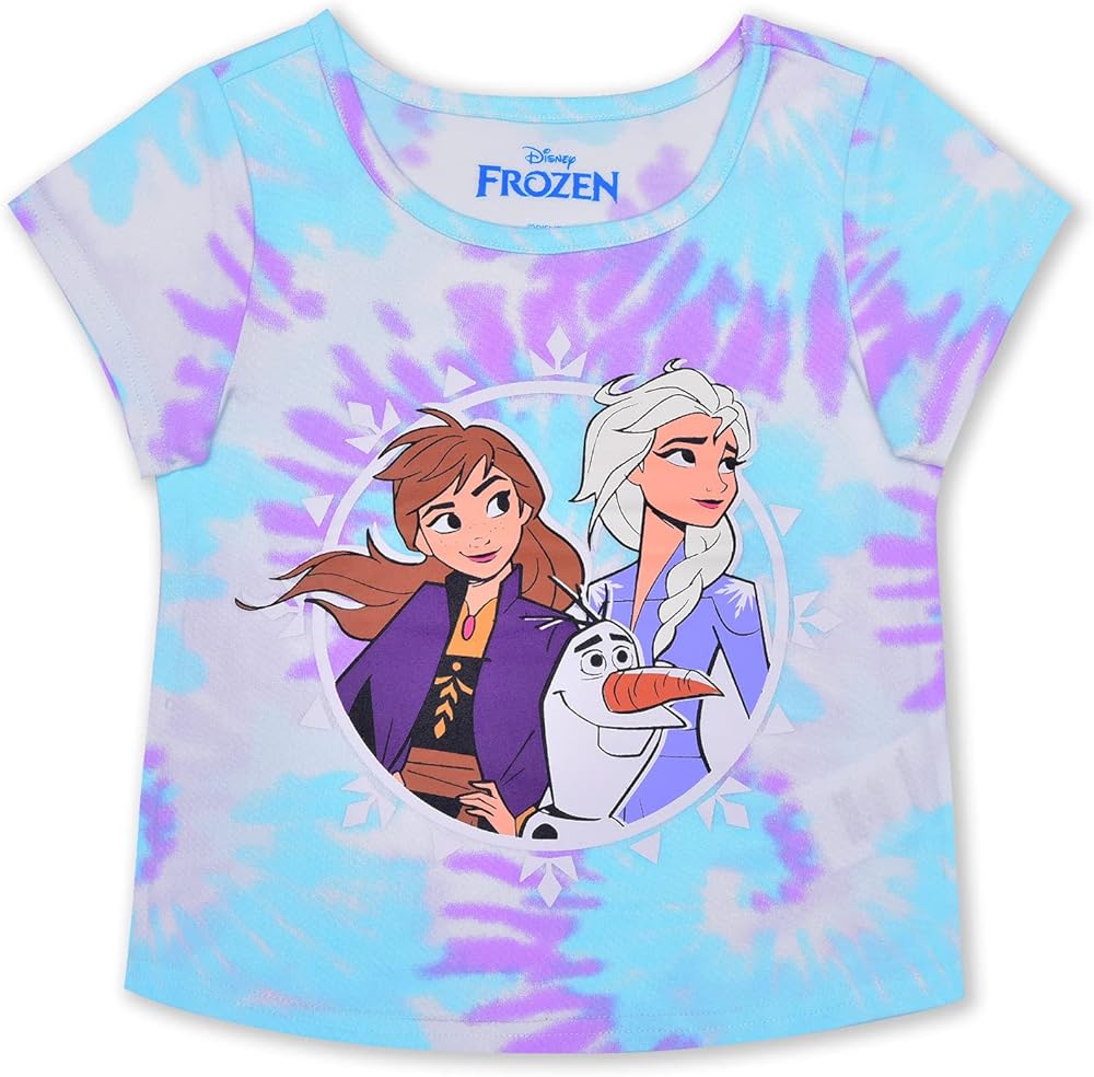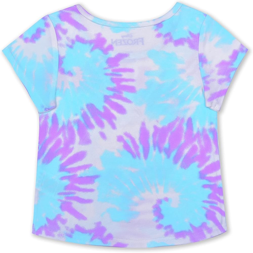 Contains One Cute Frozen Elsa, Anna and Olaf Print Purple and Blue Tie Dye T-Shirt and One Cozy Purple and Blue Tie Dye Short With a Bow