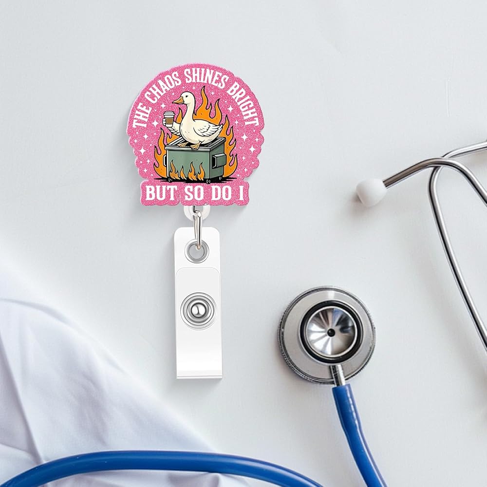 Embrace the Chaos: This funny badge reel showcases a calm goose sitting on a dumpster fire with the inspiring yet hilarious text: "The Chaos Shines Bright BUT SO DO I." It is the ultimate nurse badge reel for those chaotic 12-hour shifts, reminding you to shine even when things get crazy.